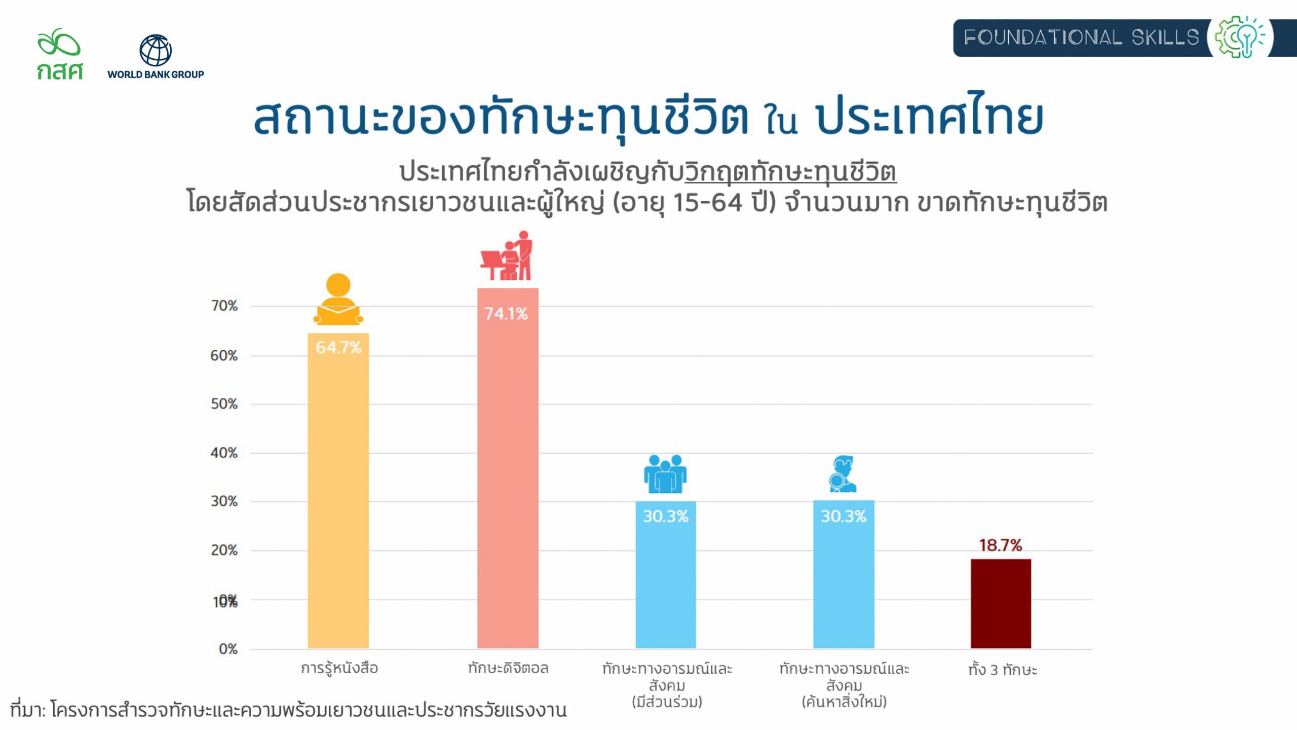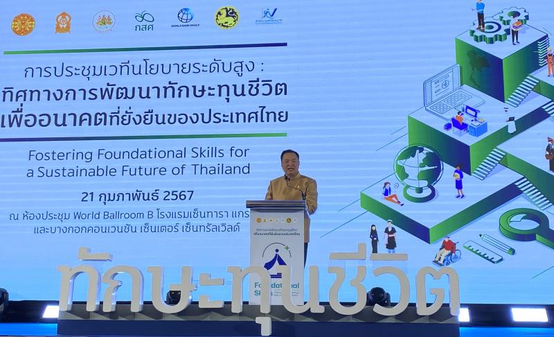 EZ Webmaster February 24, 2024 EZ Webmaster February 24, 2024 การประชุมเวทีนโยบายระดับสูง ทิศทางการพัฒนาทักษะทุนชีวิต เพื่ออนาคตที่ยั่งยืนของไทย วันที่ 21 กุมภาพันธ์ 2567 ณ ห้องประชุม World Ballroom โรงแรมเซ็นทารา แกรนด์ มีการจัดประชุมครั้งใหญ่ เพื่ออภิปรายแนวทางต่างๆ ที่ทางรัฐบาลและกลุ่มผู้มีส่วนได้ส่วนเสียสามารถเตรียมความพร้อมเพื่อรับมือกับวิกฤติด้านทักษะ และนำเสนอผลการสำรวจวิจัยจากรายงานการสำรวจโดยกองทุนเพื่อความเสมอภาคทางการศึกษา (กสศ.) และธนาคารโลก ในหัวข้อ “การส่งเสริมทักษะทุนชีวิตในประเทศไทย” นายพัฒนะพงษ์ สุขมะดัน ผู้ช่วยผู้จัดการ กสศ. ได้กล่าวเปิดการประชุมโดยเน้นการนำเสนอรายงานการวิจัยชิ้นนี้ของ กสศ. ร่วมกับธนาคารโลก พร้อมด้วยภาคีเครือข่ายหลากหลายหน่วยงาน เพื่อนำข้อค้นพบ การทบทวนสถานการณ์ การสรุปงานในช่วง 2 ปี ของการทำงาน ก่อนการนำเสนอที่จะนำมาต่อยอดในเชิงนโยบาย ลงพื้นที่เพื่อปฏิบัติจริง เพื่อให้ส่งผลต่อการพัฒนาประเทศอย่างยั่งยืนในอนาคต นางสาวธันว์ธิดา วงศ์ประสงค์ ผู้อำนวยการสำนักพัฒนานวัตกรรมเพื่อสร้างโอกาสการเรียนรู้ กสศ ระบุว่า การสำรวจทักษะและความพร้อมเยาวชนและประชากรวัยแรงงานในประเทศไทย พ.ศ. 2565 เป็นการประเมินขีดความสามารถของเยาวชนและประชากรแรงงานไทยมากกว่า 50 ล้านคนทั่วประเทศเป็นครั้งแรก เสมือนการประเมิน ‘PISA วัยแรงงาน’ โดยความร่วมมือกับธนาคารโลก เพื่อสร้างมาตรฐานการประเมินระดับสากล รวบรวมประเด็นปัญหาให้ตรงจุด เพื่อให้หน่วยงานภาครัฐและเอกชนหรือส่วนต่าง ๆ จะได้นำไปปรับใช้ในเชิงนโยบาย เพื่อเพิ่มขีดความสามารถในการพัฒนาทุนมนุษย์ เพิ่มรายได้และหลุดออกจากกับดักความยากจนอย่างยั่งยืน นายอนุทิน ชาญวีรกุล รองนายกรัฐมนตรีและรัฐมนตรีว่าการกระทรวงมหาดไทย เป็นประธานในการประชุม พร้อมแสดงวิสัยทัศน์ว่า เราเห็นสัญญาณของปัญหาที่เกิดจากความเหลื่อมล้ำมาเป็นเวลานาน ทั้งจากการวัดผลด้านทักษะระดับประเทศ และระดับนานาชาติ ความแตกต่างระหว่างผู้มีโอกาสและผู้ด้อยโอกาส มีช่วงห่างที่กว้างขึ้นเรื่อยๆ ซึ่งเราไม่ได้นิ่งนอนใจ ที่ผ่านมา รัฐบาลมีความมุ่งมั่น และมีนโยบายส่งเสริมและพัฒนาทักษะให้แก่ เด็ก เยาวชนและประชาชน ผ่านการศึกษาและการฝึกอบรม เพื่อสร้างโอกาสและเส้นทางสู่การสร้างงาน สร้างรายได้ที่ดีขึ้น เช่น นโยบาย “Thailand Zero Dropout” หรือ “Learn to Earn” สำหรับทุกช่วงวัย เพื่อส่งเสริมให้เกิดการพัฒนาทักษะการเรียนรู้จากการปฏิบัติจริงในการประกอบอาชีพ รวมถึงการที่รัฐบาลพยายามเชิญชวนภาคธุรกิจเอกชนจากทั่วโลก ที่มีจุดแข็ง ที่หลากหลาย 