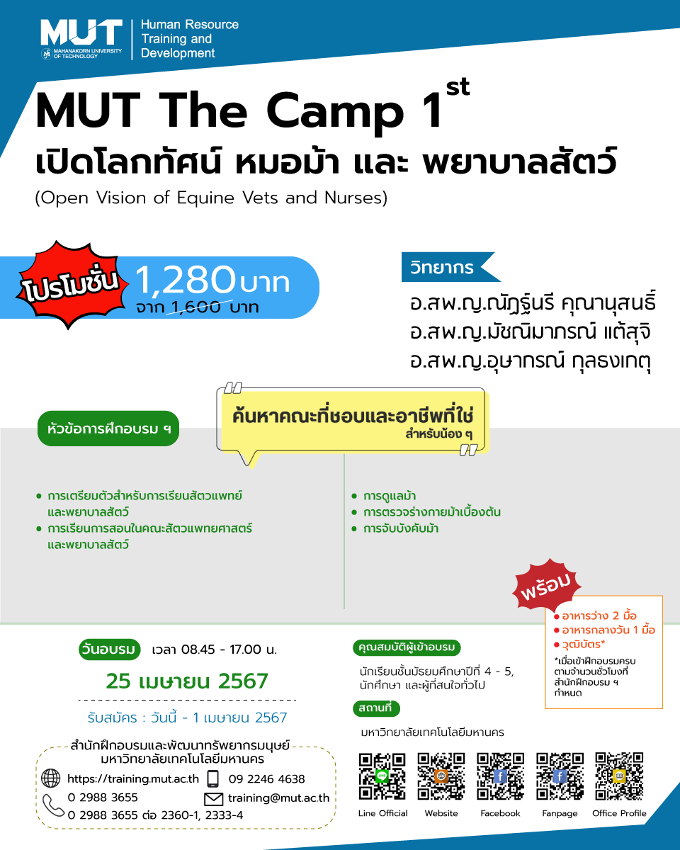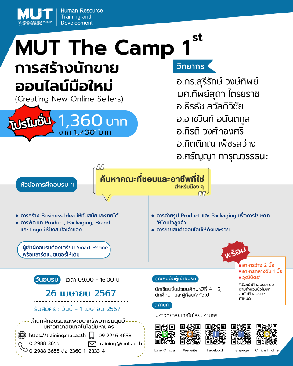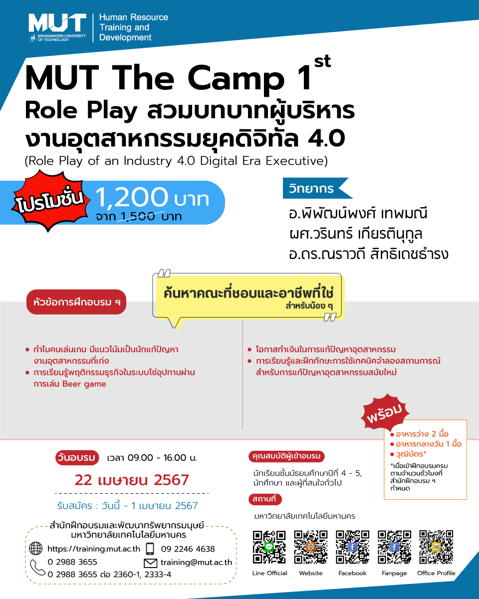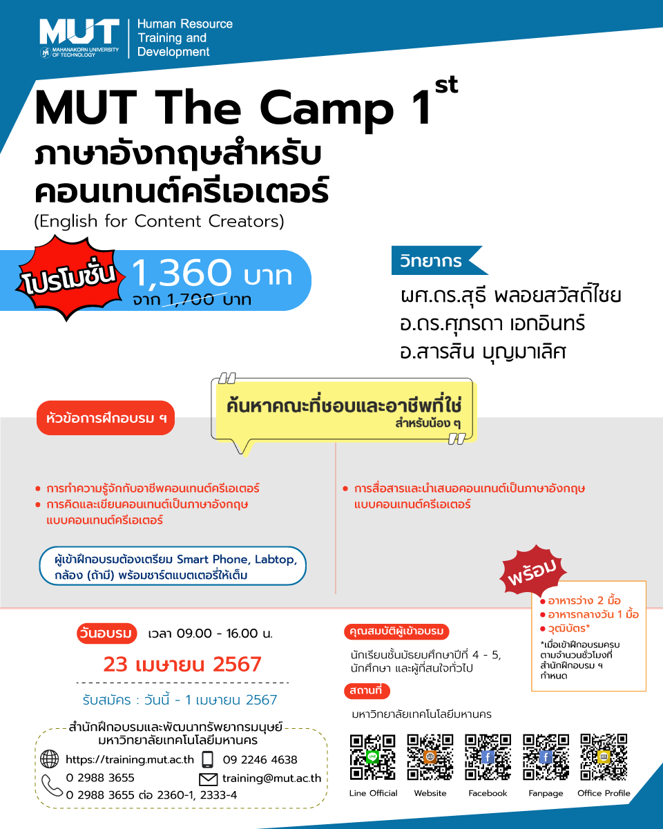 EZ Webmaster March 13, 2024 EZ Webmaster March 13, 2024 ค้นหาอาชีพที่ชอบ คณะที่ใช่ ไปกับค่าย MUT The Camp 1st หากน้อง ๆ หรือใครหลาย ๆ คนกำลังสับสนกับตัวเองว่าเรานั้นชอบอะไร และอยากลองค้นหาตัวเองในสายงานต่าง ๆ แต่ก็ยังไม่รู้ว่าจะไปหาโอกาสเหล่านั้นได้จากไหน วันนี้ eduzones มีค่ายดี ๆ มาแนะนำให้น้อง ๆ ได้เปิดโอกาสให้ตนเองลองค้นหาคณะที่ชอบและอาชีพที่ใช่ ซึ่งก็คือค่าย MUT The Camp 1st ของทางมหาวิทยาลัยเทคโนโลยีมหานครนั่นเอง โดยค่ายนี้จัดระหว่างวันที่ 22-26 เมษายน 2567 ภายในค่ายมีให้เลือกเข้าร่วมถึง 5 สายงาน ทั้งสายงานบริหาร คอนเทนต์ครีเอเตอร์ โปรแกรมเมอร์ สัตวแพทย์ ไปจนถึงผู้ประกอบการ ซึ่งไม่ว่าจะเป็นใครก็สามารถเข้าร่วมได้ รายละเอียดแต่ละค่ายมีดังนี้ 1. Role Play สวมบทบาทผู้บริหารงานอุตสาหกรรมยุคดิจิทัล 4.0 (Role Play of an Industry 4.0 Digital Era Executive) ภายในค่ายก็จะมีการจัดอบรมเกี่ยวกับการบริหารงานในอุตสาหกรรมดิจิทัล 4.0 โดยมีบรรยากาศการเรียนรู้ที่สนุก ไม่น่าเบื่อ มีเกมต่าง ๆ ให้เล่น รวมถึงมีการจำลองสถานการณ์ ให้ผู้เข้าร่วมได้สวมบทบาทเป็นผู้บริหารเพื่อฝึกทักษะต่าง ๆ ระหว่างการอบรม หัวข้อการฝึกอบรม ทำไมคนเล่นเกม มีแนวโน้มเป็นนักแก้ปัญหางานอุตสาหกรรมที่เก่ง การเรียนรู้พฤติกรรมธุรกิจในระบบโซ่อุปทานผ่านการเล่น Beer game โอกาสทำเงินในการแก้ปัญหาอุตสาหกรรม การเรียนรู้และฝึกทักษะการใช้เทคนิคจำลองสถานการณ์สำหรับการแก้ปัญหาอุตสาหกรรมสมัยใหม่ รายชื่อวิทยากร: อ.พิพัฒน์พงศ์ เทพมณี, ผศ.วรินทร์ เกียรตินุกูล, อ.ดร.ณราวดี สิทธิเดชธำรง ค่าใช้จ่ายการฝึกอบรม: 1,200 บาท (จาก 1,500 บาท) วัน-เวลาการฝึกอบรม: 22 เมษายน 2567 เวลา 09.00-16.00 น. 2. ภาษาอังกฤษสำหรับคอนเทนต์ครีเอเตอร์ (English for Content Creators) หากใครอยากประกอบอาชีพเป็นคอนเทนต์ครีเอเตอร์ ภาษาอังกฤษก็นับว่าเป็นสิ่งที่สำคัญสำหรับคนทำอาชีพนี้เช่นกัน โดยเฉพาะการนำเสนองานและการติดต่อประสานงานกับลูกค้า ซึ่งถ้าหากอยากขยายกลุ่มลูกค้าให้กว้างขึ้น ก็ต้องใช้ทักษะนี้ช่วยด้วยอีกแรง หัวข้อการฝึกอบรม การทำความรู้จักกับอาชีพคอนเทนต์ครีเอเตอร์ การคิดและเขียนคอนเทนต์เป็นภาษาอังกฤษแบบคอนเทนต์ครีเอเตอร์ การสื่อสารและนำเสนอคอนเทนต์เป็นภาษาอังกฤษแบบคอนเทนต์ครีเอเตอร์ รายชื่อวิทยากร: ผศ.ดร.สุธี พลอยสวัสดิ์ไชย, อ.ดร.ศุภรดา เอกอินทร์, อ.สารสิน บุญมาเลิศ ค่าใช้จ่ายการฝึกอบรม: 1,360 บาท (จาก 1,700 บาท) วัน-เวลาการฝึกอบรม: 23 เมษายน 2567 เวลา 09.00-16.00 น. 3. สร้างหุ่นยนต์เบื้องต้นด้วย Arduino + ESP32 (Basic robotic with Arduino + ESP32) ในปัจจุบันอาชีพนักเขียนโปรแกรมต่างก็เป็นที่ต้องการของตลาดโลกอยู่มากมาย และฐานเงินเดือนของคนประกอบอาชีพนี้ก็ค่อนข้าง