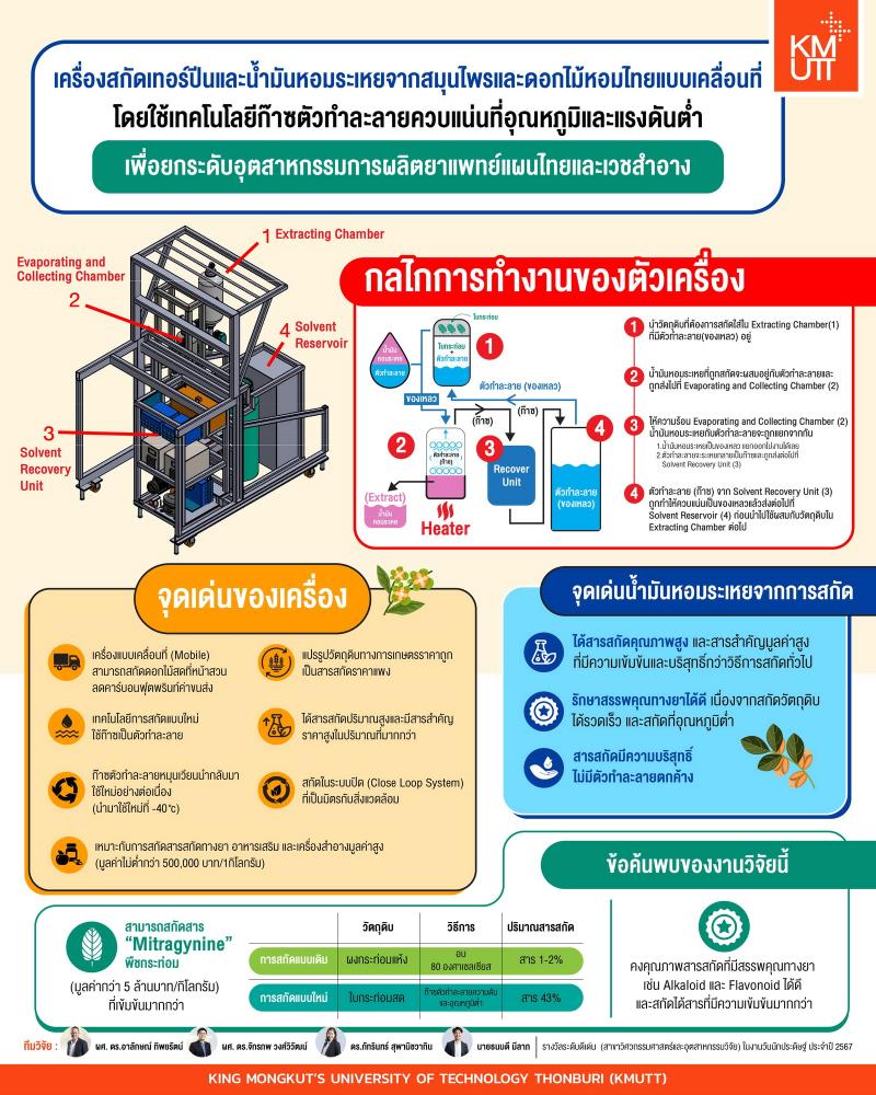 EZ Webmaster March 28, 2024 EZ Webmaster March 28, 2024 เครื่องสกัดเทอร์ปีนและน้ำมันหอมระเหยแบบเคลื่อนที่ นวัตกรรมเพื่อผลิตสารมูลค่าสูงจากไม้ดอกและสมุนไพรไทย น้ำมันหอมระเหยจากไม้ดอกและสมุนไพรบางชนิด เป็นสารสกัดมูลค่าสูงที่กำลังเป็นที่นิยมในตลาดโลก ด้วยคุณสมบัติอันหลากหลายที่สามารถนำไปใช้ประโยชน์ทั้งในด้านสุขภาพ ความงาม และเวชภัณฑ์ ข้อมูลจาก imarcgroup.com พบว่าในปี 2566 ตลาดน้ำมันหอมระเหยทั่วโลกมีมูลค่าสูงถึง 12.2 พันล้านดอลลาร์สหรัฐ และมีแนวโน้มจะเติบโตอย่างต่อเนื่องแตะ 24.5 พันล้านดอลลาร์สหรัฐภายในปี 2575 เช่นเดียวกับตลาดน้ำมันหอมระเหยในประเทศไทยที่ในปี 2565 ตลาดน้ำมันหอมระเหยเติบโตและมีมูลค่ากว่า 3,000 ล้านบาท (ข้อมูลจาก positioningmag.com) ด้วยโอกาสในการแข่งขันในตลาดโลกผนวกกับจุดแข็งของประเทศไทยที่มีทรัพยากรทางธรรมชาติที่อุดมสมบูรณ์ มีความหลากหลายด้านพันธุ์พืชทั้งไม้ดอกและสมุนไพรมากกว่า 20,000 ชนิดถือเป็นแหล่งวัตถุดิบชั้นดีสำหรับการสกัดน้ำมันหอมระเหย ทีมวิจัยจากภาควิชาวิศวกรรมอาหาร คณะวิศวกรรมศาสตร์ มหาวิทยาลัยเทคโนโลยีพระจอมเกล้าธนบุรี ซึ่งประกอบด้วย ผศ. ดร.อาลักษณ์ ทิพยรัตน์ ผศ. ดร.จักรภพ วงศ์วิวัฒน์ ดร.ภัทรินทร์ สุพานิชวาทิน และ นายธนบดี มีลาภ จึงร่วมกันคิดค้น “เครื่องสกัดเทอร์ปีนและน้ำมันหอมระเหยแบบเคลื่อนที่จากสมุนไพรและดอกไม้หอมไทยโดยใช้เทคโนโลยีก๊าซตัวทำละลายควบแน่นที่อุณหภูมิและแรงดันต่ำเพื่อยกระดับอุตสาหกรรมการผลิตยาแพทย์แผนไทยและเวชสำอาง” ขึ้นเป็นผลสำเร็จ เครื่องสกัดเทอร์ปีนและน้ำมันหอมระเหยแบบเคลื่อนที่ เป็นวิธีการการสกัดน้ำมันหอมระเหยรูปแบบใหม่ที่เป็นระบบปิด (Close Loop System) โดยใช้ก๊าซเป็นตัวทำละลาย (Solvent) ทำให้เกิดการควบแน่นเป็นของเหลว เป็นการสกัดในอุณหภูมิต่ำ -20 องศาเซลเซียส ซึ่งตัวทำละลายที่ใช้สามารถนำกลับมาใช้ใหม่หมุนเวียนในระบบปิดได้อย่างต่อเนื่อง วิธีนี้ทำให้ได้สารสกัดและสาระสำคัญมูลค่าสูงในปริมาณที่มาก มีความบริสุทธิ์สูง ใช้เวลาในการสกัดน้อยลง และสามารถรักษาคุณภาพของสารสกัดไว้ได้มากขึ้น ซึ่งสามารถแก้ไขข้อจำกัดของการสกัดน้ำมันหอมละเหยวิธีเดิมอย่างการสกัดวิธีสกัดแบบการกลั่นไอน้ำ (Steam Distillation) หรือ วิธีสกัดด้วยตัวทำละลายอินทรีย์ (Solvent Extraction) ได้ ผศ. ดร.อาลักษณ์ ทิพยรัตน์ อาจารย์ประจำภาควิชาวิศวกรรมอาหาร คณะวิศวกรรมศาสตร์ และหัวหน้าคณะวิจัยฯ กล่าวว่า “จากการทดสอบการสกัดกระท่อม (Mitragyna Speciosa Korth) เพื่อสกัดสาร “Mitragynine” ที่มีฤทธิ์ในการแก้ปวดคล้ายกับมอร์ฟีน ซึ่งเป็นสารสำคัญที่มีมูลค่าสูงถึง 5 ล้านบาทต่อกิโลกรัม ด้วยเครื่องสก