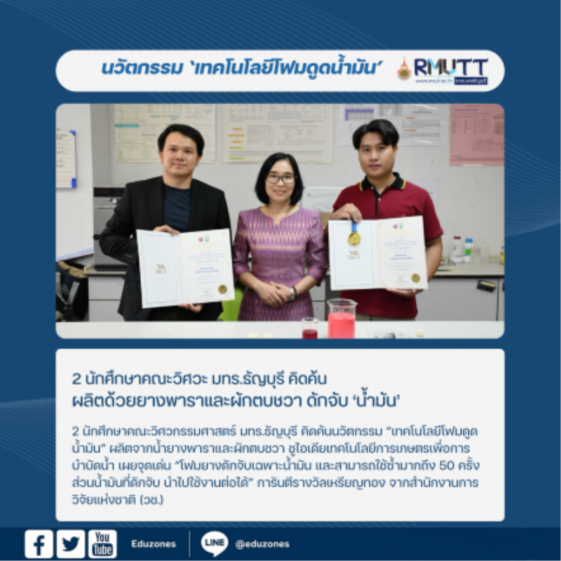 tui sakrapee March 5, 2024 นวัตกรรม “เทคโนโลยีโฟมดูดน้ำมัน” ผลิตด้วยยางพาราและผักตบชวา ดักจับ ‘น้ำมัน’ tui sakrapee March 5, 2024 2 นักศึกษาคณะวิศวกรรมศาสตร์ มทร.ธัญบุรี คิดค้นนวัตกรรม “เทคโนโลยีโฟมดูดน้ำมัน” ผลิตจากน้ำยางพาราและผักตบชวา ชูไอเดียเทคโนโลยีการเกษตรเพื่อการบำบัดน้ำ เผยจุดเด่น “โฟมยางดักจับเฉพาะน้ำมัน และสามารถใช้ซ้ำมากถึง 50 ครั้ง ส่วนน้ำมันที่ดักจับ นำไปใช้งานต่อได้” การันตีรางวัลเหรียญทอง จากสำนักงานการวิจัยแห่งชาติ (วช.) นายภพธร คล้ายเข็ม (เนม) นักศึกษาปริญญาโท ภาควิชาวิศวกรรมวัสดุและโลหการ และนายพฤติพงศ์ พันธมนัสโสภา (เด่น) นักศึกษาปริญญาเอก คณะวิศวกรรมศาสตร์ มหาวิทยาลัยเทคโนโลยีราชมงคลธัญบุรี (มทร.ธัญบุรี) คิดค้นและพัฒนาผลงานเทคโนโลยีโฟมดูดน้ำมัน (Green Oil-Absorbing Technology) โดยมี รศ.ดร.วารุณี อริยวิริยะนันท์… Continue Reading