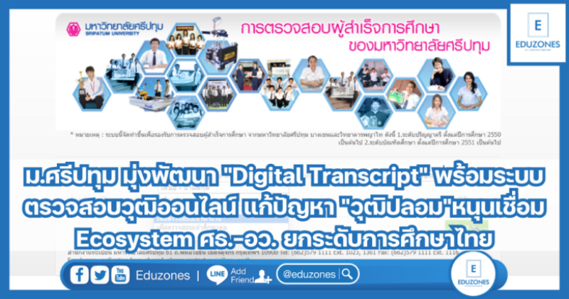 EZ Webmaster April 19, 2024 ม.ศรีปทุม มุ่งพัฒนา “Digital Transcript” พร้อมระบบตรวจสอบวุฒิออนไลน์ แก้ปัญหา “วุฒิปลอม”หนุนเชื่อม Ecosystem ศธ.-อว. ยกระดับการศึกษาไทย EZ Webmaster April 19, 2024 มหาวิทยาลัยศรีปทุม ให้บริการ “Digital Transcript” และระบบตรวจสอบวุฒิการศึกษาออนไลน์ ผ่านเว็บไซต์ช่วยให้บริษัทและหน่วยงานต่างๆ ตรวจสอบวุฒิของผู้สมัครงานหรือสมัครเรียนได้ง่ายๆ สะดวก รวดเร็ว และปลอดภัย หมดปัญหาการรอคอยเอกสารยืนยันวุฒิจากมหาวิทยาลัย และป้องกันปัญหาวุฒิปลอม นักศึกษา-ศิษย์เก่า ดาวน์โหลด Digital Transcript ได้ง่ายๆ ผ่าน 3 ช่องทางออนไลน์ โมบายแอป เว็บไซต์ และไลน์ สามารถใช้สมัครงานได้ทันที ไม่ต้องเสียเวลาเดินทางหรือรอเอกสาร ปัจจุบันออกเอกสารแล้วทั้งหมด 8,481 ฉบับ หนุนเชื่อม Ecosystem ระบบเอกสารการศึกษาไทย ทุกระดับชั้นของกระทรวงการศึกษา และกระทรวงการอุดมศึกษา วิทยาศาสตร์ วิจัย และนวัตกรรม (อว.) เพื่อเพิ่มประสิทธิภาพในการเชื่อมโยงการศึกษาในทุกระดับ… Continue Reading