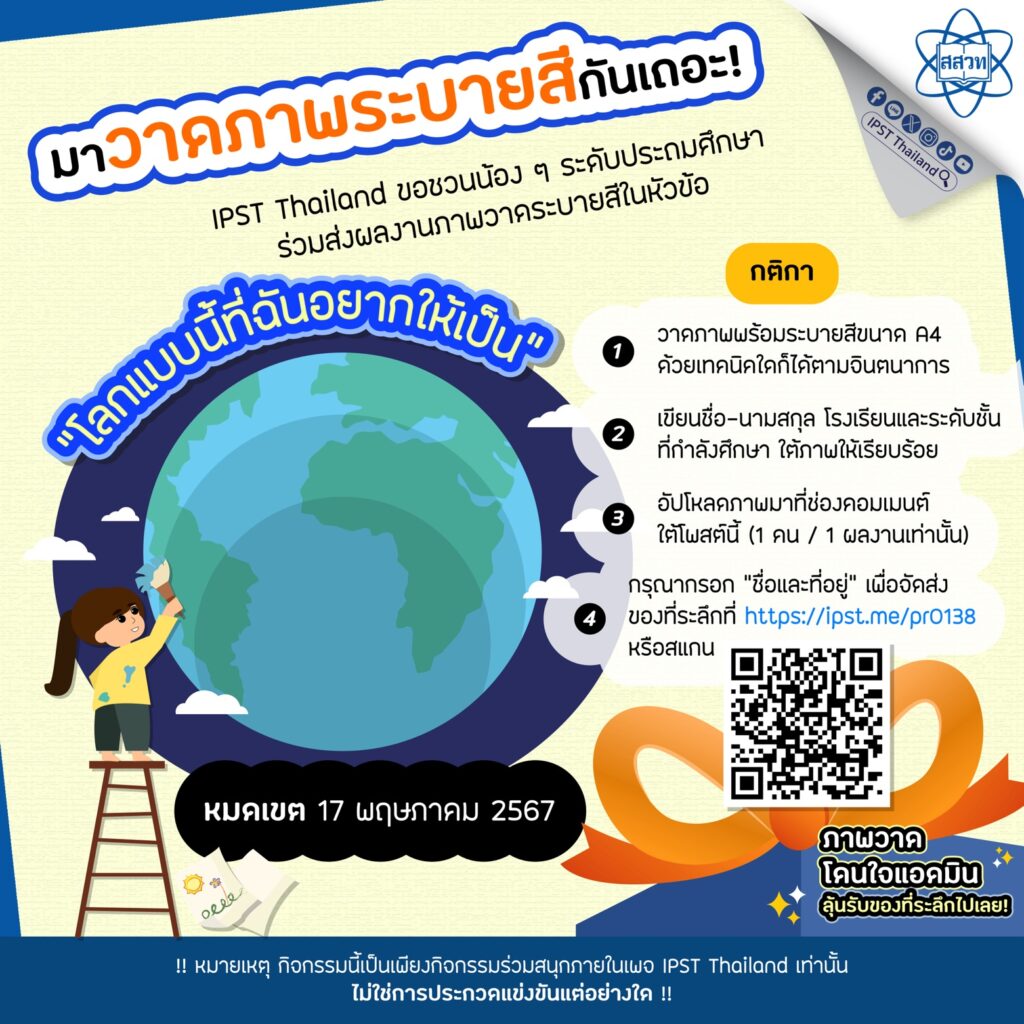 EZ Webmaster May 14, 2024 EZ Webmaster May 14, 2024 โค้งสุดท้ายหมดเขต 17 พ.ค.นี้ ร่วมสนุกไม่ใช่ประกวด มาวาดภาพอวดจินตนาการกัน “โลกแบบนี้ที่ฉันอยากให้เป็น” เพจ IPST Thailand สถาบันส่งเสริมการสอนวิทยาศาสตร์และเทคโนโลยี (สสวท) ชวนน้อง ๆ ประถมศึกษาร่วมสนุกส่งผลงานภาพวาดระบายสีหัวข้อ “โลกแบบนี้ที่ฉันอยากให้เป็น” โดยวาดภาพพร้อมระบายสีขนาด A4 ด้วยเทคนิคใดก็ได้ตามจินตนาการ เขียนชื่อ-นามสกุล โรงเรียนและระดับชั้นที่กำลังศึกษาอัปโหลดภาพแล้วส่งมาลุ้นรับของที่ระลึก ผลงานใครโดนใจรับของที่ระลึกจากเพจ IPST Thailand รายละเอียดที่ https://www.ipst.ac.th/showcase/60842/20240417-showcase-ipst.html หมดเขตส่งวันที่ 17 พฤษภาคม 2567