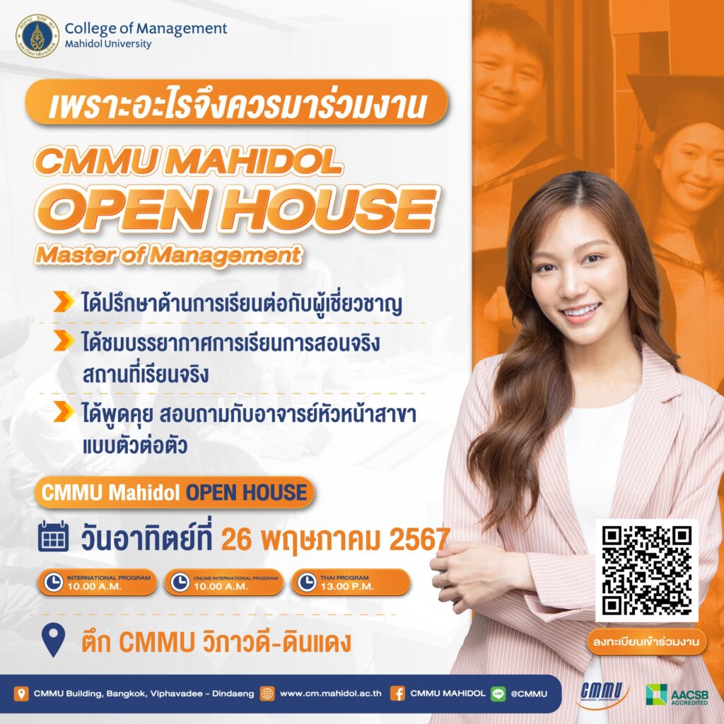 EZ Webmaster May 23, 2024 EZ Webmaster May 23, 2024 CMMU เปิดบ้านแนะเส้นทางการเรียนต่อป.โท พร้อมดึงผู้เชี่ยวชาญให้คำปรึกษาความก้าวหน้าในสายอาชีพ วิทยาลัยการจัดการ มหาวิทยาลัยมหิดล หรือ CMMU เชิญผู้ที่กำลังวางแผนศึกษาต่อระดับปริญญาโท และปริญญาเอกด้านการจัดการทั้งหลักสูตรไทยและหลักสูตรนานาชาติร่วมงาน CMMU MAHIDOL Open House กิจกรรมเปิดบ้านเพื่อรับแนะนำจากผู้เชี่ยวชาญ ในการศึกษาต่อในสาขาที่มีความเหมาะสม ตรงกับความต้องการของภาคธุรกิจ ตลาดแรงงานแห่งอนาคต และร่วมชมบรรยากาศการเรียนการสอนจากสถานที่จริง พร้อมพูดคุยกับอาจารย์หัวหน้าสาขาที่จะมาให้ข้อมูล หลักสูตรแนวทางการเรียนการสอนแบบตัวต่อตัว ในวันอาทิตย์ที่ 26 พฤษภาคม 2024 ณ ตึกวิทยาลัยการจัดการ มหาวิทยาลัยมหิดล ถนนวิภาวดี – ดินแดง โดยแบ่งเป็น หลักสูตรนานาชาติและหลักสูตร Online International ช่วงเวลา 10.00- 12.00 น. หลักสูตรไทย ช่วงเวลา 13.00 – 15.30 น. และหลักสูตรระดับปริญญาเอก ช่วงเวลา 10.30 – 12.00 น. ผู้สนใจสามารถ ลงทะเบียนผ่านทาง https://admission.cm.mahidol.ac.th/openhouse/register สอบถามเพิ่มเติม โทร 02 – 206 – 2000 ต่อ 5802 หรือ ดูรายละเอียดเพิ่มเติม Facebook : https://www.facebook.com/CMMUMAHIDOL