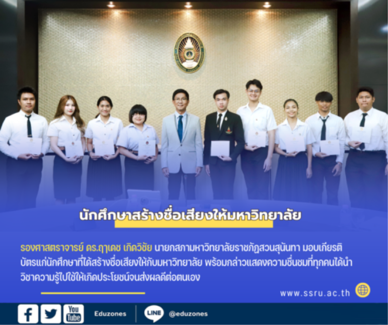 tui sakrapee May 1, 2024 สภามหาวิทยาลัยมอบเกียรติบัตรชื่นชมนักศึกษาสวนสุนันทา ที่สร้างชื่อเสียงให้มหาวิทยาลัย tui sakrapee May 1, 2024 นักศึกษา สวนสุนันทา เข้ารับการแสดงความชื่นชมและเกียรติบัตรจากสภามหาวิทยาลัย หลังจากที่ได้สร้างชื่อเสียงให้กับมหาวิทยาลัย เมื่อวันที่ 24 เมษายน 2567 รองศาสตราจารย์ ดร.ฤๅเดช เกิดวิชัย นายกสภามหาวิทยาลัยราชภัฏสวนสุนันทา มอบเกียรติบัตรแก่นักศึกษาที่ได้สร้างชื่อเสียงให้กับมหาวิทยาลัย พร้อมกล่าวแสดงความชื่นชมที่ทุกคนได้นำวิชาความรู้ไปใช้ให้เกิดประโยชน์จนส่งผลดีต่อตนเอง รายชื่อนักศึกษาที่ได้รับรางวัล 1. นางสาวบุษกร จันทะเวช คณะครุศาสตร์ -รางวัลชนะเลิศ Triathlon Thailand championships 2023 สมาคมกีฬา ไตรกีฬาแห่งประเทศไทย -รางวัลชนะเลิศ Duathlon Thailand championships 2024 สมาคมกีฬา… Continue Reading