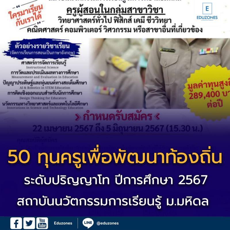 EZ Webmaster June 4, 2024 EZ Webmaster June 4, 2024 50 ทุนครูเพื่อพัฒนาท้องถิ่นระดับปริญญาโท ปีการศึกษา 2567 สถาบันนวัตกรรมการเรียนรู้ ม.มหิดล ทุนครูเพื่อพัฒนาท้องถิ่นระดับปริญญาโท ปีการศึกษา 2567 จำนวน 50 ทุน! (ทุนในประเทศ) หลักสูตรวิทยาศาสตรมหาบัณฑิต สาขาวิชาวิทยาศาสตร์และเทคโนโลยีศึกษา (หลักสูตรนานาชาติ) สถาบันนวัตกรรมการเรียนรู้ เข้าร่วมเป็นหนึ่งในสถาบันผลิตของโครงการผลิตครูเพื่อพัฒนาท้องถิ่น ระดับปริญญาโททางการสอน รุ่นบรรจุปี พ.ศ.2563 จำนวน 50 ทุน มูลค่าทุนตามที่จ่ายจริงไม่เกิน 289,400 บาท/ปี/คน รับสมัครตั้งแต่บัดนี้ ถึง 5 มิถุนายน 2567 (เวลา 15.30 น.)สมัครออนไลน์ผ่านทาง https://link.buu.ac.th/kru2563เอกสารประกอบการสมัคร https://bit.ly/3JvClDZรายละเอียดหลักสูตร https://bit.ly/3WfMts3 หลักสูตรวิทยาศาสตรมหาบัณฑิต สาขาวิชาวิทยาศาสตร์และเทคโนโลยีศึกษา เป็นหลักสูตรนานาชาติ จัดการเรียนการสอนเป็นภาษาอังกฤษ สอนโดยคณาจารย์ที่มีความเชี่ยวชาญในสาขา วิทยาศาสตร์และเทคโนโลยีศึกษา สาขาคณิตศาสตร์ศึกษา และสาขาอื่น ๆ ที่เกี่ยวข้อง ผู้เรียนได้เสริมสร้างองค์ความรู้ ทักษะ กระบวนการคิด เพื่อเป็นผู้นำด้านการศึกษา สร้างสรรค์นวัตกรรมเพื่อการเรียนรู้สู่สังคมและความเป็นเลิศในระดับสากล สอบถามเพิ่มเติมติดต่อ ผศ.ดร.น้ำค้าง ศรีวัฒนาโรทัย ประธานหลักสูตรโทร 02 441 9734 หรือ 02 441 9724 หรืออีเมล์ namkang.sri@mahidol.edu