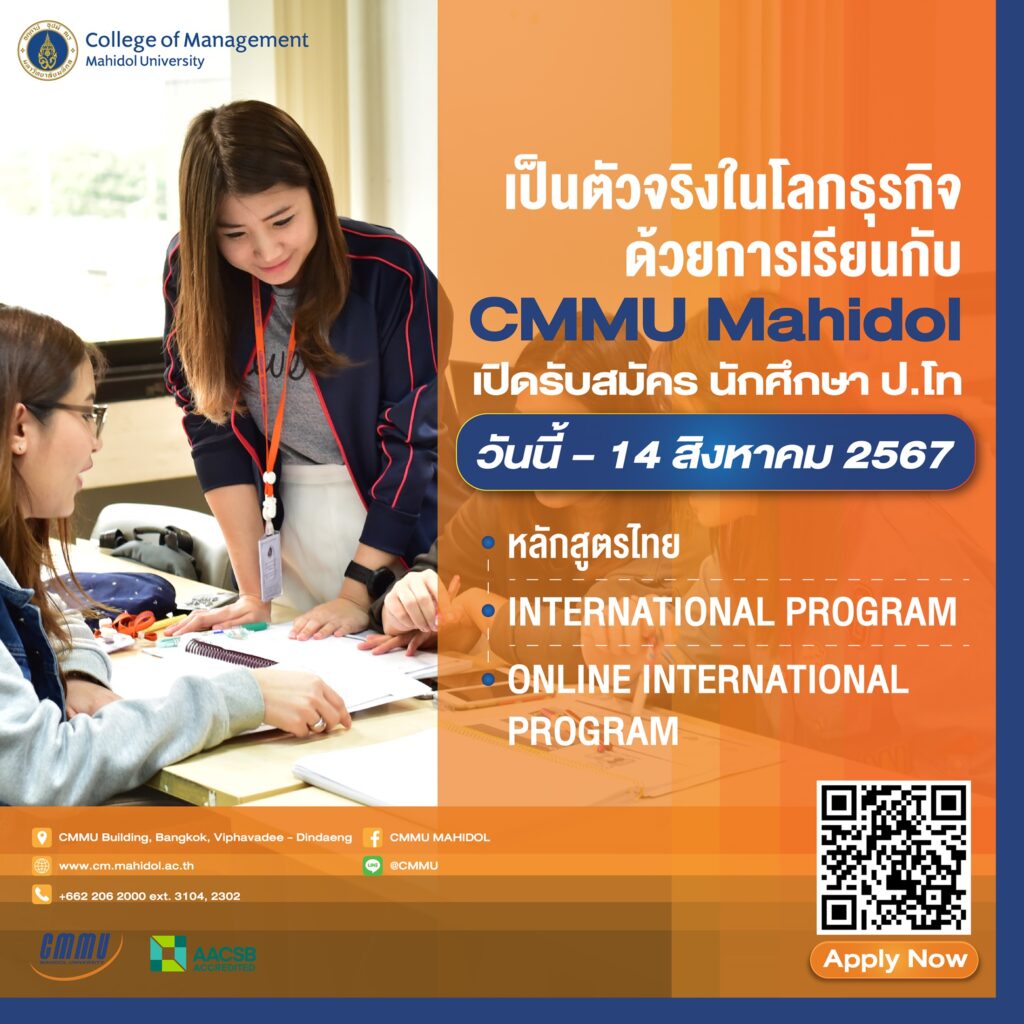 EZ Webmaster July 4, 2024 EZ Webmaster July 4, 2024 CMMU เปิดรับสมัครนักศึกษาระดับ ป.โท 15 สาขา ครอบคลุมหลักสูตรไทย อินเตอร์ และออนไลน์ วิทยาลัยการจัดการ มหาวิทยาลัยมหิดล หรือ ซีเอ็มเอ็มยู (CMMU) เปิดรับสมัครผู้สนใจเข้าศึกษาต่อระดับปริญญาโท เพื่อพัฒนาองค์ความรู้ที่ทันสมัยให้แก่ผู้เรียน สร้างทักษะเฉพาะทาง เพิ่มโอกาสในหน้าที่การงาน สู่การเป็นตัวจริงในโลกธุรกิจ โดยหลักสูตรที่เปิดรับสมัคร ได้แก่ หลักสูตรไทย ในสาขาการจัดการธุรกิจ สาขาทุนมนุษย์และการจัดการองค์กร สาขาการเงิน สาขาการตลาด สาขาการจัดการและกลยุทธ์ สาขาภาวะผู้ประกอบการและนวัตกรรม สาขาการจัดการธุรกิจสุขภาพ หลักสูตรนานาชาติ Corporate Finance (CF), Entrepreneurship Management (EN), General Management (GM), Healthcare & Wellness Management (HWM), Marketing and Management (MM), Double Degree Int’l Management (GMDD) และ หลักสูตร ออนไลน์ นานาชาติ โดยทั้งสามหลักสูตร เปิดรับสมัครตั้งแต่วันนี้ จนถึงวันที่ 14 สิงหาคม 2567 ผ่าน https://apply.cm.mahidol.ac.th/web/ สอบถามข้อมูลโทรศัพท์ 02-206-2000 หรือ ดูรายละเอียดเพิ่มเติม https://www.facebook.com/CMMUMAHIDOL