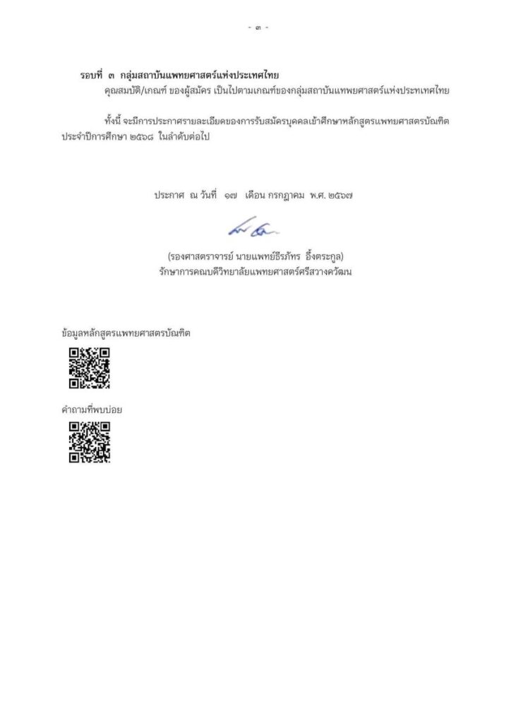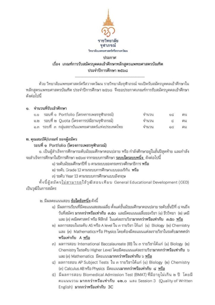 EZ Webmaster July 24, 2024 EZ Webmaster July 24, 2024 เกณฑ์รับสมัครหลักสูตรแพทย์ศาสตร์ วิทยาลัยแพทย์ศาสตร์ศรีสวางวัฒน TCAS68 ประกาศแล้ว ! เกณฑ์การรับสมัครเข้าศึกษา หลักสูตรแพทย์ศาสตร์บัณฑิตของวิทยาลัยแพทย์ศาสตร์ศรีสวางวัฒ ราชวิทยาลัยจุฬาภรณ์ ผ่านทาง TCAS68 จำนวนที่รับ 32 คน แบ่งรับจำนวน 3 รอบ – รอบที่ 1 portfolio (โครงการเพชรจุฬาภรณ์) จำนวน 14 คน – รอบที่ 2 quota (โครงการปณิธานจุฬาภรณ์) จำนวน 4 คน – รอบที่ 3 Admission รับผ่าน กลุ่มสถาบันแพทยศาสตร์แห่งประเทศไทย จำนวน 14 คน ดังประกาศ สนใจรายละเอียดเพิ่มเติมคลิก