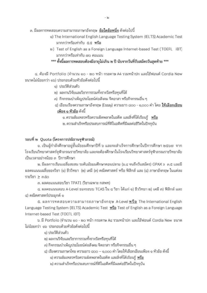 จุฬาลงกรณ์มหาวิทยาลัยเปลี่ยนแปลงกำหนดการรับสมัครและคัดเลือกนักเรียนเข้าศึกษาในจุฬาลงกรณ์มหาวิทยาลัย EZ WebmasterDecember 11, 2025 จุฬาลงกรณ์มหาวิทยาลัยเปลี่ยนแปลงกำหนดการรับสมัครและคัดเลือกนักเรียนเข้าศึกษาในจุฬาลงกรณ์มหาวิทยาลัย ระดับปริญญาตรี ปีการศึกษา 2569 (TCAS69) รอบที่ 1 แฟ้มสะสมผลงาน (Portfolio) รอบที่ 2 โควตา (Quota) ในหลักสูตรปกติ และรอบ Early Admission…