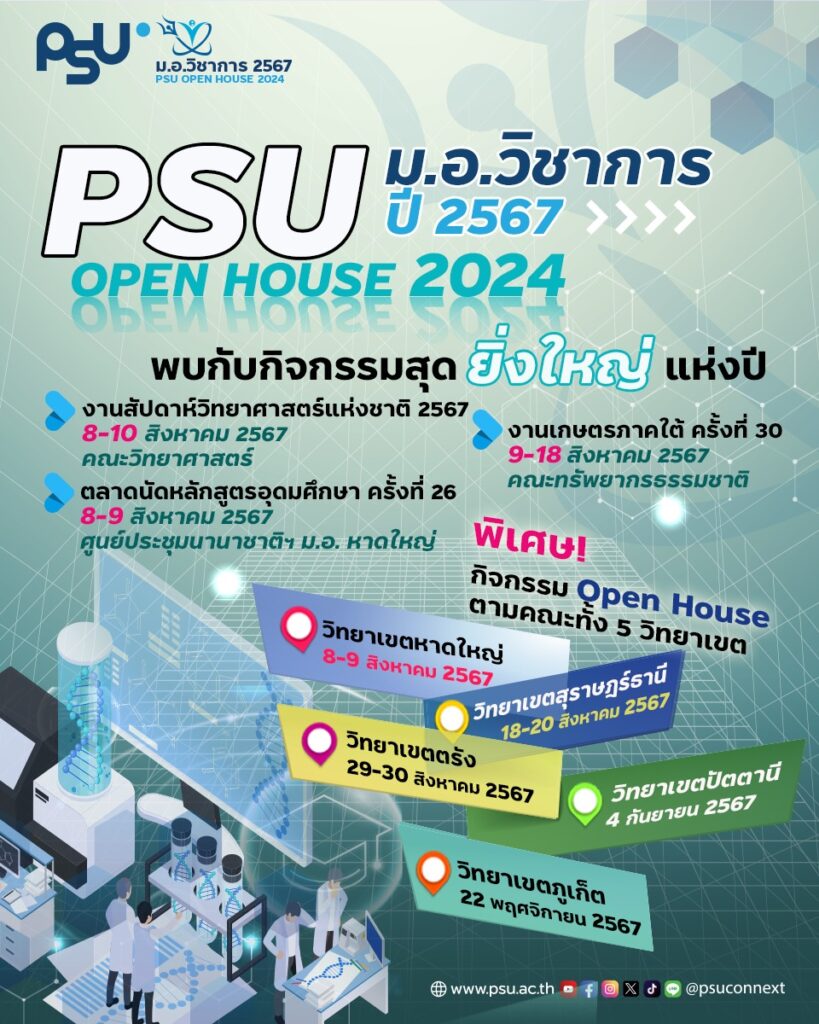 EZ Webmaster July 25, 2024 EZ Webmaster July 25, 2024 งาน OPEN HOUSE มหาวิทยาลัยสงขลานครินทร์ 2024 สวัสดีค่ะน้องๆ วันนี้ทาง Eduzones มีงานใหญ่มามาบอกน้องๆ 68 โดยเฉพาะสำหรับคนที่สนใจงาน เปิดบ้านของมหาวิทยาลัยสงขลานครินทร์ ม.อ. วิชาการ ประจำปี 2567 𝗣𝗦𝗨 𝗢𝗣𝗘𝗡𝗛𝗢𝗨𝗦𝗘 𝟮𝟬𝟮𝟰 ในงานนี้น้องๆจะได้พบกับกิจกรรมต่างๆมากมายสุดยิ่งใหญ่ของทางมหาวิทยาลัย อาทิเช่น งาน สัปดาห์วิทยาศาสตร์แห่งชาติ 8 – 10 สิงหาคม 2567 ณ คณะวิทยาศาสตร์ ม.อ. หาดใหญ่ รายละเอียด : คลิก นิทรรศการ ตลาดนัดหลักสูตรอุดมศึกษา ครั้งที่ 26 8 – 9 สิงหาคม 2567 ณ ศูนย์ประชุมนานาชาติ ม.อ. รายละเอียด : คลิก งานเกษตรภาคใต้ ครั้งที่ 30 9 – 18 สิงหาคม 2567 ณ คณะทรัพยากรธรรมชาติ ม.อ.หาดใหญ่ รายละเอียด : คลิก คณะเศรษฐศาสตร์ มหาวิทยาลัยสงขลานครินทร์ – econpsu 8 สิงหาคม 2567 รายละเอียด คลิก คณะนิติศาสตร์ มหาวิทยาลัยสงขลานครินทร์ – PSU Law 8 สิงหาคม 2567 รายละเอียด : คลิก คณะศิลปศาสตร์ มหาวิทยาลัยสงขลานครินทร์ 8 – 9 สิงหาคม 2567 รายละเอียด :คลิก สาขาการจัดการอุตสาหกรรมการบินและการบริการ 8 สิงหาคม 2567 รายละเอียด : คลิก คณะวิทยาศาสตร์ ม.อ. หาดใหญ่(งานสัปดาห์วิทยาศาสตร์แห่งชาติ 2567) 8 – 10 สิงหาคม 2567 รายละเอียด : คลิก คณะวิศวกรรมศาสตร์ ม.อ. 8 – 9 สิงหาคม 2567 รายละเอียด : คลิก คณะเทคนิคการแพทย์ ม.สงขลานครินทร์ : Faculty of Medical Technology, PSU 9 สิงหาคม 2567 รายละเอียด : คลิก คณะการจัดการสิ่งแวดล้อม – ENVI PSU จัดการสิ่งแวดล้อม 9 สิงหาคม 2567 รายละเอียด : คลิก สาขาวิชา บริหารธุรกิจ คณะวิทยาการจัดการ 9 สิงหาคม 2567 รายละเอียด : คลิก คณะทรัพยากรธรรมชาติ(งานเกษตรภาคใต้ ครั้งที่ 30) 9 – 18 สิงหาคม 2567 รายละเอียด : คลิก คณะทันตแพทยศาสตร์ มหาวิทยาลัยสงขลานครินทร์ – Dent PSU 9 – 10 สิงหาคม 2567 รายละเอียด : คลิก สถาบันวัฒนธรรมศึกษากัลยาณิวัฒนา ม.อ. หาดใหญ่ 8 – 9 สิงหาคม 2567 รายละเอียด : คลิก สำนักเครื่องมือวิทยาศาสตร์และการทดสอบ ม.สงขลานครินทร์ 9 สิงหาคม 2567 รายละเอียด : คลิก PSUIC Prince of Songkla University International College Hatyai Campus วันที่ 8 – 9 สิงหาคม 2567 รายละเอียด : คลิก คณะสัตวแพทยศาสตร์ มหาวิทยาลัยสงขลานครินทร์ 9 สิงหาคม 2567 รายละเอียด : คลิก คณะอุตสาหกรรมเกษตรวันที่ 9 สิงหาคม 2567 รายละเอียด : คลิก ทั้งนี้ยังมีกิจกรรมพิเศษ คือ OPEN HOUSE ทั้ง 5 วิทยาเขตประกอบไปด้วย วิทยาเขตหาดใหญ่ 8 – 9 สิงหาคม 2567 วิทยาเขตสุราษฎร์ธานี 18 – 20 สิงหาคม 2567 วิทยาเขตตรัง 29 – 30 สิงหาคม 2567 วิทยาเขตปัตตานี 4 กันยายน 2567 วิทยาเขตภูเก็ต 22 พฤศจิกายน 2567 เรียกได้ว่าเป็นงานใหญ่ของทางมหาวิทยาลัยเลยทีเดียว น้องๆอย่าลืมไปสนุกและเก็บเกี่ยวความรู้กันนะคะ ติดตามเว็บไซต์ของมหาวิทยาลัย Prince of Songkla University
