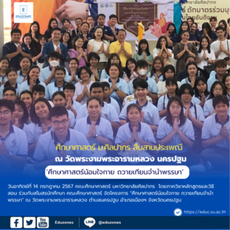 tui sakrapee July 14, 2024 ศึกษาศาสตร์ ม.ศิลปากร สืบสานประเพณี “ศึกษาศาสตร์น้อมใจกาย ถวายเทียนจำนำพรรษา” ณ วัดพระงามพระอารามหลวง นครปฐม tui sakrapee July 14, 2024 วันอาทิตย์ที่ 14 กรกฎาคม 2567 เวลา 08.30 – 10.30 น.คณะศึกษาศาสตร์ มหาวิทยาลัยศิลปากร โดยภาควิชาหลักสูตรและวิธีสอน ร่วมกับสโมสรนักศึกษา คณะศึกษาศาสตร์ ได้จัดโครงการ “ศึกษาศาสตร์น้อมใจกาย ถวายเทียนจำนำพรรษา” ณ วัดพระงามพระอารามหลวง ตำบลนครปฐม อำเภอเมืองฯ จังหวัดนครปฐม โดยได้รับเกียรติจาก ศาสตราจารย์ ดร.คณิต เขียววิชัย คณบดีคณะศึกษาศาสตร์เป็นประธานเปิดโครงการ และได้รับเกียรติจาก ผู้ช่วยศาสตราจารย์ ดร.อรพิณ ศิริสัมพันธ์ (หัวหน้าภาควิชาหลักสูตรและวิธีสอน) เป็นประธานเชิญเทียนจำนำพรรษา… Continue Reading