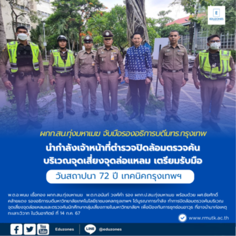 tui sakrapee July 12, 2024 ผกก.สน.ทุ่งมหาเมฆ จับมือรองอธิการบดีมทร.กรุงเทพ นำกำลังเจ้าหน้าที่ตำรวจการปิดล้อมตรวจค้นบริเวณจุดเสี่ยงจุดล่อแหลม เนื่องจากวันครบรอบสถาปนา 72 ปี เทคนิคกรุงเทพฯ tui sakrapee July 12, 2024 ผกก.สน.ทุ่งมหาเมฆ นำกำลังเจ้าหน้าที่ตำรวจการปิดล้อมตรวจค้นบริเวณจุดเสี่ยงจุดล่อแหลม เนื่องจากวันครบรอบสถาปนา 72 ปี เทคนิคกรุงเทพฯ เพื่อป้องกันการซุกซ่อนอาวุธ ที่อาจนำมาก่อเหตุทะเลาะวิวาท วันอาทิตย์ ที่ 14 ก.ค. 67 มหาวิทยาลัยเทคโนโลยีราชมงคลกรุงเทพฯ ครบรอบสถาบัน 72 ปี โดยจะมีการจัดกิจกรรม “ รวมใจเป็นหนึ่งเดียว สถาปนา 72 ปี เทคนิคกรุงเทพฯ ” บริเวณ สนามกีฬากลางราชมงคลกรุงเทพ ถ.นางลิ้นจี่ แขวงทุ่งมหาเมฆ เขตสาทร กทม.… Continue Reading