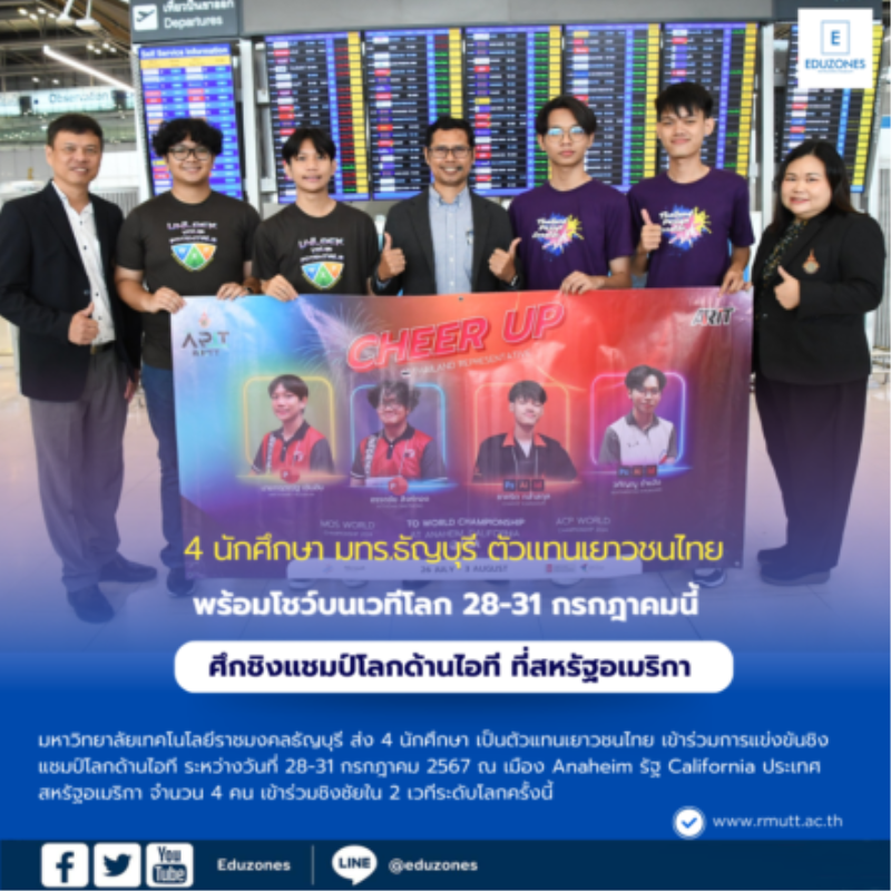 tui sakrapee July 26, 2024 มทร.ธัญบุรีส่ง 4 นักศึกษาตัวแทนเยาวชนไทย เข้าแข่งขันชิงแชมป์โลกด้านไอที ณ เมือง Anaheim รัฐ California สหรัฐอเมริกา tui sakrapee July 26, 2024 มหาวิทยาลัยเทคโนโลยีราชมงคลธัญบุรีส่ง 4 นักศึกษา มทร.ธัญบุรี ตัวแทนเยาวชนไทย เข้าร่วมการแข่งขันชิงแชมป์โลกด้านไอที ระหว่างวันที่ 28-31 กรกฎาคม 2567 ณ เมือง Anaheim รัฐ California ประเทศสหรัฐอเมริกาจำนวน 4 คน ที่เข้าร่วมชิงชัย โดยแบ่งเป็น 2 เวที เวที Microsoft office Specialist World Championship (MOS WC 2024) จำนวน… Continue Reading