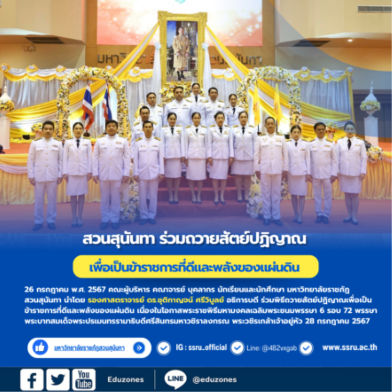 tui sakrapee July 26, 2024 สวนสุนันทา ร่วมถวายสัตย์ปฏิญาณเพื่อเป็นข้าราชการที่ดีและพลังของแผ่นดิน tui sakrapee July 26, 2024 วันที่ 26 กรกฎาคม พ.ศ. 2567 คณะผู้บริหาร คณาจารย์ บุคลากร นักเรียนและนักศึกษา มหาวิทยาลัยราชภัฏสวนสุนันทา นำโดย รองศาสตราจารย์ ดร.ชุติกาญจน์ ศรีวิบูลย์ อธิการบดี ร่วมพิธีถวายสัตย์ปฏิญาณเพื่อเป็นข้าราชการที่ดีและพลังของแผ่นดิน เนื่องในโอกาสพระราชพิธีมหามงคลเฉลิมพระชนมพรรษา 6 รอบ 72 พรรษา พระบาทสมเด็จพระปรเมนทรรามาธิบดีศรีสินทรมหาวชิราลงกรณ พระวชิรเกล้าเจ้าอยู่หัว 28 กรกฎาคม 2567 ณ อาคารศูนย์สุขภาพและกีฬา ชั้น 4 มหาวิทยาลัยราชภัฏสวนสุนันทา .… Continue Reading