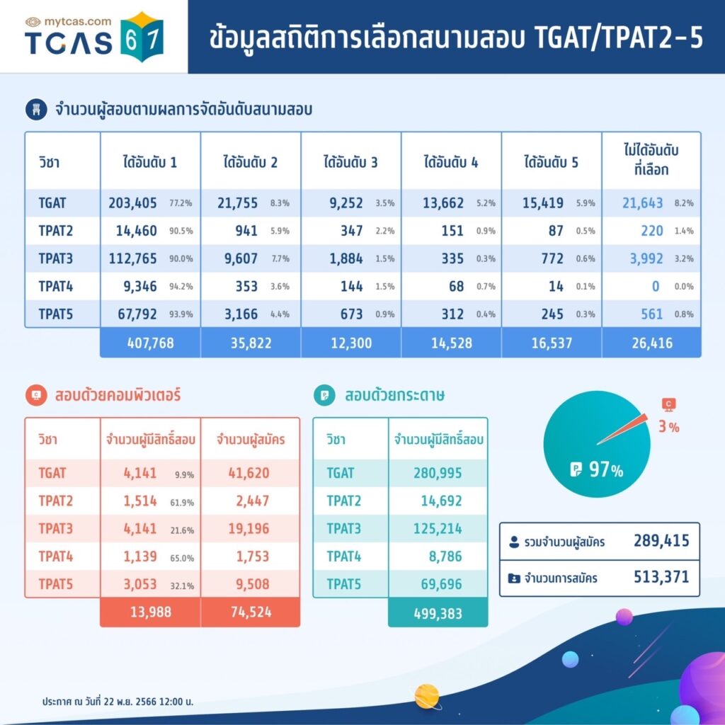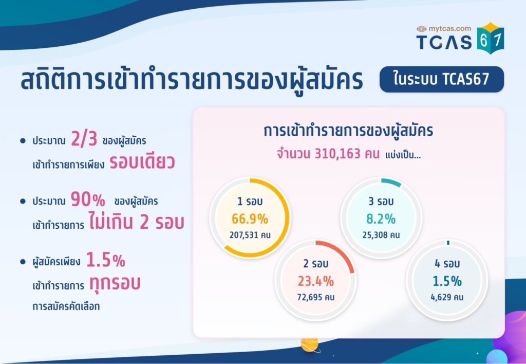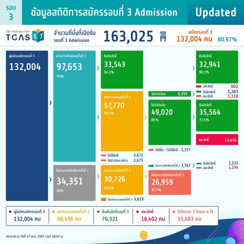 EZ Webmaster August 26, 2024 EZ Webmaster August 26, 2024 รวมข้อมูลสถิติรอบ3 Admission ของ TCAS67 ทปอ. เผยข้อมูลสถิติ TCAS67 รอบ 3 Admission ทั้งข้อมูลสถิติการสมัครสอบ สถิติการเลือกสนามสอบ ข้อมูลสถิติการสมัครสอบ TGAT TPAT A-Level สำหรับปีการศึกษา 2567 ตามไปดูกันว่า TCAS67 มีจำนวนสถิติการสอบเป็นอย่างไรบ้าง ข้อมูลสถิติการสมัครรอบที่ 3 Admission จำนวนที่นั่งเปิดรับ : 132,004 คน ผ่านการคัดเลือกครั้งที่ 1 : 97,653 คน ยืนยันสิทธิ์ : 33,543 คน ขอประมวลผลครั้งที่1 : 57,770 คน ยืนยันสิทธิ์ 35,564 คน ขอประมวลผลครั้งที่ 2 : 30,726 คน ยืนยันสิทธิ์ 2,533 คน ยืนยันสิทธิ์รอบที่ 3 : 76,321 คน สละสิทธิ์ 16,402 10 สาขาวิชาที่มีการสมัครมากที่สุด อันดับที่ 1 พยาบาลศาสตร์ อันดับที่ 2 นิติศาสตร์ อันดับที่ 3 บริหารธุรกิจ อันดันที่ 4 การบัญชี อันดับที่ 5 อังกฤษ อันดับที่ 6 สาธารณสุข อันดับที่ 7 ท่องเที่ยวและการโรงแรม อันดับที่ 8 รัฐศาสตร์ อันดับที่ 9 เศรษฐศาสตร์ อันดับที่ 10 เทคนิคการแพทย์ ข้อมูลสถิติการเลือกสนามสอบ TGAT/TPAT2-5 จำนวนผู้สมัคร : 289,415 คน จำนวนการสมัคร : 513,371 คน สอบด้วยคอมพิวเตอร์ : 74,524 คน สอบด้วยกระดาษ : 499,383 คน ข้อมูลสติการสมัครสอบ TGAT/TPAT2-5 จำนวนผู้สมัครสอบ : 289,415 คน นักเรียนปีนี้ : 240,882 คน นักเรียนปีที่ผ่านมา : 48,533 คน ข้อสอบแบบกระดาษ : 270,565 คน ข้อสอบแบบคอมพิวเตอร์ : 20,184 คน TGAT มีผู้สมัครสอบจำนวน 285,133 คน TPAT 2 มีผู้สมัครสอบจำนวน 16,206 คน TPAT 3 มีผู้สมัครสอบจำนวน 129,353 คน TPAT 4 มีผู้สมัครสอบจำนวน 9,925 คน TPAT 5 มีผู้สมัครสอบจำนวน 72,748 คน รวมจำนวนการสมัคร 513,365 คน ข้อมูลสติการสมัครสอบ A-Level จำนวนผู้สมัครสอบ A-level 187,342 คน ชีววิทยา : 96,754 คน ฟิสิกส์ : 103,810 คน ภาษาไทย : 160,955 คน สังคมศึกษา : 156,197 คน คณิตศาสตร์ประยุกต์ 1 : 146,413 คน ภาษาอังกฤษ : 179,287 คน เคมี : 99,017 คน คณิตศาสตร์ประยุกต์ 2 : 110,932 คน วิทยาศาสตร์ประยุกต์ : 66,101 คน ภาษาฝรั่งเศส : 2,687 คน ภาษาเยอรมัน : 1,008 คน ภาษาญี่ปุ่น : 4,225 คน ภาษาเกาหลี : 3,813 คน ภาษาจีน : 8,293 คน ภาษาบาลี : 684 คน ภาษาสเปน : 957 คน ข้อมูลสถิติการเข้าทำรายการของผู้สมัคร แหล่งข้อมูล : https://www.mytcas.com