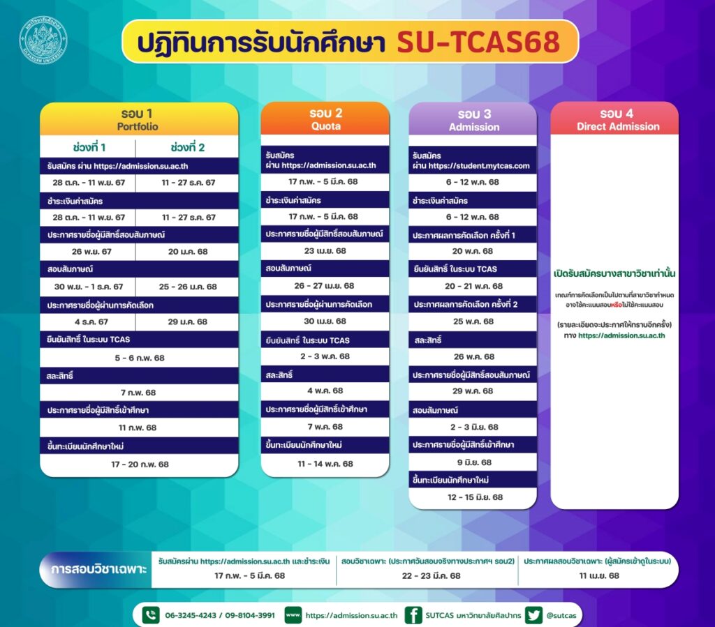 EZ Webmaster August 26, 2024 EZ Webmaster August 26, 2024 เปิดปฏิทิน รับสมัครนักศึกษา 2568 ม.ศิลปากร TCAS68 ปฏิทินการรับนักศึกษา SU-TCAS68 มหาวิทยาลัยศิลปากร ประจำปีการศึกษา 2568 มาแล้วค่ะ สามารถดูรายละเอียดได้ที่โดยปฏิทินข้างล่างนี้ เกณฑ์การรับสมัครแต่ละรอบจะเริ่มประกาศประมาณต้นเดือนตุลาคม 2567 เป็นต้นไป รายละเอียดในการสมัครเพิ่มเติม คลิก