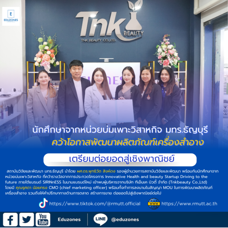 tui sakrapee August 28, 2024 tui sakrapee August 28, 2024 นักศึกษาจากหน่วยบ่มเพาะวิสาหกิจ มทร.ธัญบุรี คว้าโอกาสพัฒนาผลิตภัณฑ์เครื่องสำอาง เตรียมต่อยอดสู่เชิงพาณิชย์ เมื่อวันที่ 27 สิงหาคม 2567 สถาบันวิจัยและพัฒนา มทร.ธัญบุรี นำโดย ผศ.ดร.พุทธิวัต สิงห์ดง รองผู้อำนวยการสถาบันวิจัยและพัฒนา พร้อมกับนักศึกษาจากหน่วยบ่มเพาะวิสาหกิจ ที่คว้ารางวัลจากการประกวดโครงการ Innovative Health and beauty Startup Driving to the future ภายใต้แบรนด์ SIRINnESS ในนามแบรนด์ใหม่ เข้าพบผู้บริหารจากบริษัท ทีเอ็นเค บิวตี้ จำกัด (Tnkbeauty Co.,Ltd) โดยมี คุณรุศดา น้อยทรง CMO (chief marketing officer) พร้อมทั้งทำการลงนามในสัญญา MOU ในการพัฒนาผลิตภัณฑ์เครื่องสำอาง รวมถึงให้คำปรึกษาทางด้านการตลาด สร้างการขาย ต่อยอดไปสู่เชิงพาณิชย์ต่อไป