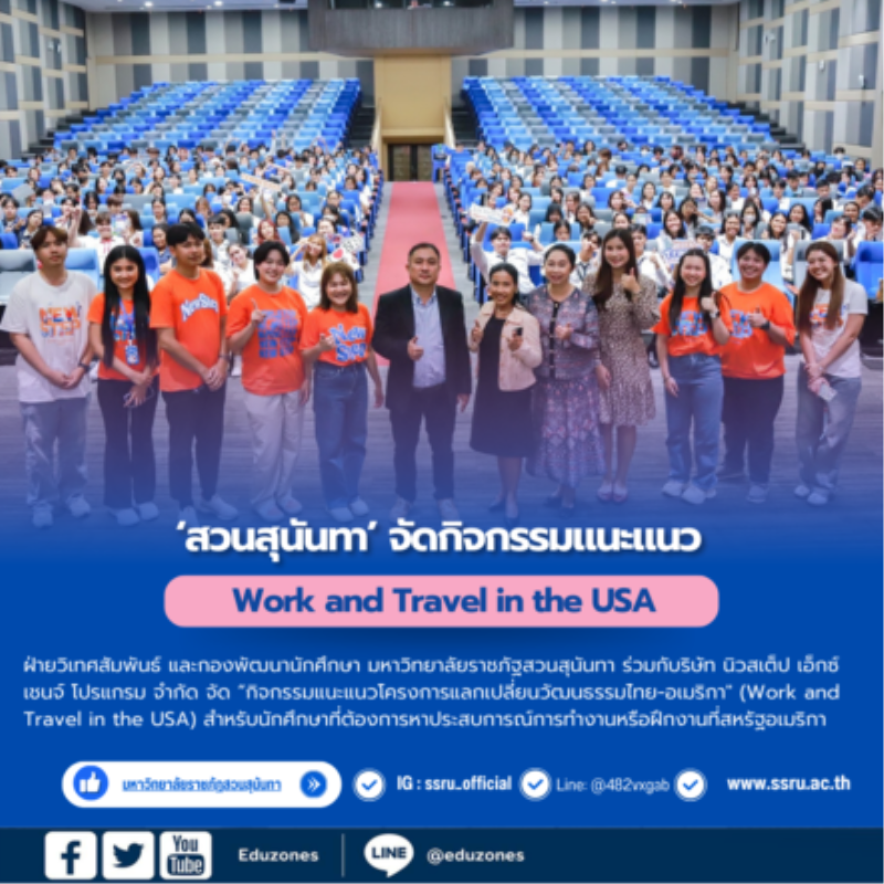 tui sakrapee August 14, 2024 สวนสุนันทาจัดกิจกรรมแนะแนวโครงการแลกเปลี่ยนวัฒนธรรมไทย-อเมริกา tui sakrapee August 14, 2024 วันที่ ๘ สิงหาคม ๒๕๖๗ – ฝ่ายวิเทศสัมพันธ์ และกองพัฒนานักศึกษา มหาวิทยาลัยราชภัฐสวนสุนันทา ร่วมกับริษัท นิวสเต็ป เอ็กซ์เชนจ์ โปรแกรม จำกัด จัด “กิจกรรมแนะแนวโครงการแลกเปลี่ยนวัฒนธรรมไทย-อเมริกา” (Work and Travel in the USA) สำหรับนักศึกษาที่ต้องการหาประสบการณ์การทำงานหรือฝึกงานที่สหรัฐอเมริกา กิจกรรมดังกล่าวจะเปิดโอกาสให้นักศึกษาได้เรียนรู้ชีวิตความเป็นอยู่และวัฒนธรรมของชาวอเมริกันผ่านการทำงานในช่วงปิดภาคเรียนฤดูร้อน เป็นระยะเวลา ๓ – ๔ เดือน (เดือนมีนาคม ถึงเดือนกรกฎาคม ๒๕๖๘) ซึงมีนักศึกษาเข้าร่วมฟังกิจกรรมแนะแนวดังกล่าวจำนวนประมาณ… Continue Reading