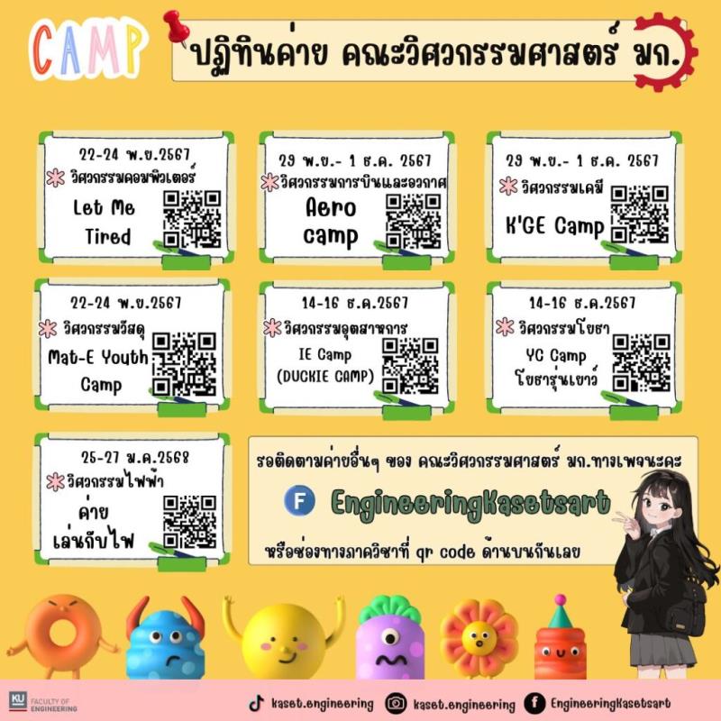 EZ Webmaster September 5, 2024 EZ Webmaster September 5, 2024 เปิดปฏิทินค่าย เตรียมความพร้อมสู่คณะวิศวกรรมศาสตร์ ม.เกษตรศาสตร์ เตรียมพบกับ ! ค่ายเตรียมความพร้อมสู่คณะวิศวกรรมศาสตร์ มก. ที่รอคอยพร้อมกันหรือยัง สำหรับน้องๆ ที่สนใจคณะวิศวกรรมศาสตร์ มาดูกันเลยว่ามีค่ายอะไรกันบ้าง กับปฏิทินค่ายกิจกรรมคณะวิศวกรรมศาสตร์ วันที่ 22-24 พ.ย.2567 วิศวกรรมคอมพิวเตอร์ กับ ค่าย Let Me Tired https://kasets.art/XmuWTB วันที่ 29 พ.ย.-1 ธ.ค.2567 วิศวกรรมการบินและอวกาศ กับ ค่าย Aero Camp https://kasets.art/0iuwLP วิศวกรรมเคมี กับค่าย K’GE Camp https://kasets.art/vNA9e4 วันที่ 22-24 พ.ย.2567 วิศวกรรมวัสดุ กับ ค่าย Mat-E Youth Camp https://kasets.art/ULUogz วันที่ 14-16 ธ.ค.2567 วิศวกรรมอุตสาหการ กับค่าย IE Camp (DUCKIE CAMP) https://kasets.art/HSJJO6 วิศวกรรมโยธา กับค่าย YC Camp โยธารุ่นเยาว์ https://kasets.art/E9oDDR วันที่ 25-27 ม.ค.2568 วิศวกรรมไฟฟ้า กับค่าย เล่นกับไฟ https://kasets.art/yoOnnr ติดตามค่ายอื่นๆ ที่ได้ที่เพจคณะวิศวกรรมศาสตร์ EngineeringKasetsart หรือ คลิกได้เลยค่ะ