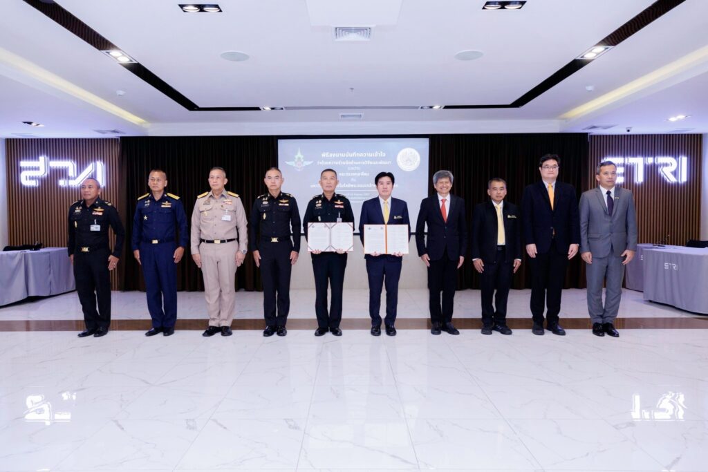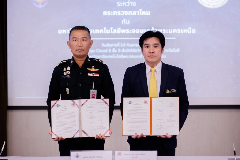 EZ Webmaster September 13, 2024 EZ Webmaster September 13, 2024 มจพ. ร่วมมือการวิจัยและพัฒนาเทคโนโลยีและวิทยาศาสตร์ กับ กระทรวงกลาโหม มจพ. ลงนามความร่วมมือการวิจัยและพัฒนาเทคโนโลยีและวิทยาศาสตร์ กับ กระทรวงกลาโหม ศ.ดร.สุชาติ เซี่ยงฉิน อธิการบดี มหาวิทยาลัยเทคโนโลยีพระจอมเกล้าพระนครเหนือ (มจพ.) ศ.ดร.สมฤกษ์ จันทรอัมพร รองอธิการบดีฝ่ายวิจัยและพัฒนาเทคโนโลยีสารสนเทศ และ รศ.ดร.สุรพันธ์ ยิ้มมั่น รองอธิการบดีฝ่ายส่งเสริมอุตสาหกรรมและพัฒนาธุรกิจศึกษา ร่วมลงนามความร่วมมือด้านการวิจัยและพัฒนาวิทยาศาสตร์และเทคโนโลยี กับ พล.ท เขมชาติ ปัตตะนุ เจ้ากรมวิทยาศาสตร์และเทคโนโลยีกลาโหม พล.ต. อดิศร จรัส ผู้อำนวยการสำนักนโยบายและแผน กรมยุทธการทหาร เจ้ากรมยุทธการทหาร และ พล.ต ระวี ตั้งพิทักษ์กุล ผู้อำนวยการสำนักงานวิจัยและพัฒนาการทางทหารกองทัพบก พร้อมด้วยผู้บริหารทั้งสองฝ่ายร่วมเป็นสักขีพยาน ในวันที่ 10 กันยายน 2567 ณ ห้อง Cloud 9 ชั้น 9 สำนักวิจัยวิทยาศาสตร์และเทคโนโลยี มจพ.พิธีลงนามบันทึกความเข้าใจว่าด้วยความร่วมมือด้านการวิจัยและพัฒนาระหว่าง กระทรวงกลาโหม (กห.) และ มหาวิทยาลัยเทคโนโลยีพระจอมเกล้าพระนครเหนือ (มจพ.) มีวัตถุประสงค์ เพื่อการพัฒนาศักยภาพการวิจัยและพัฒนาวิศวกรรมศาสตร์ วิทยาศาสตร์และสาขาอื่น ๆ เพื่อเสริมสร้างขีดความสามารถในการบริหารจัดการและการบูรณาการด้านการวิจัยและพัฒนาสร้างนวัตกรรมใหม่ด้านวิทยาศาสตร์และเทคโนโลยีป้องกันประเทศให้สามารถขยายผลการวิจัยและพัฒนาสู่การผลิตและใช้งานของกองทัพอย่างเป็นรูปธรรม อันจะเป็นการส่งเสริมด้านอุตสาหกรรมป้องกันประเทศให้เกิดการพึ่งพาตนเอง และเพิ่มศักยภาพในการแข่งขันของประเทศ รวมทั้งแลกเปลี่ยนความรู้ ทรัพยากร และบุคลากร ด้านวิจัยและพัฒนา ตลอดจนการผลิตและพัฒนาบุคลากรเพื่อการเพิ่มพูนความรู้ที่ทั้งสองฝ่ายมีความสนใจร่วมกัน เพื่อพัฒนาให้มีคุณภาพ มาตรฐาน และปริมาณ สอดคล้องกับความต้องการของประเทศ โดยมีระยะเวลาความร่วมมือ 5 ปี ขวัญฤทัย ข่าว/วุฒิสิทธิ์ ถ่ายภาพ