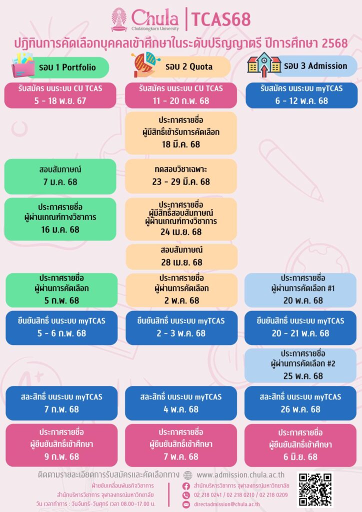 EZ Webmaster September 17, 2024 EZ Webmaster September 17, 2024 จุฬาฯ ประกาศกำหนดการคัดเลือก ผ่านTCAS68 จุฬาลงกรณ์มหาวิทยาลัย ได้ประกาศกำหนดการคัดเลือกผ่านระบบ TCAS ทั้ง 3 รอบ รอบที่ 1 Portfolio รับสมัคร วันที่ 5-18 พ.ย.67 สมัครกับ จุฬาฯ ที่ https://admission.chula.ac.th รอบที่ 2 โควตา รับสมัคร วันที่ 11-20 ก.พ.68 สมัครกับ จุฬาฯ ที่ https://admission.chula.ac.th รอบที่ 3 Admission รับสมัคร วันที่ 6-12 พ.ค.68 สมัครกับ ทปอ. ที่ https://www.mytcas.com