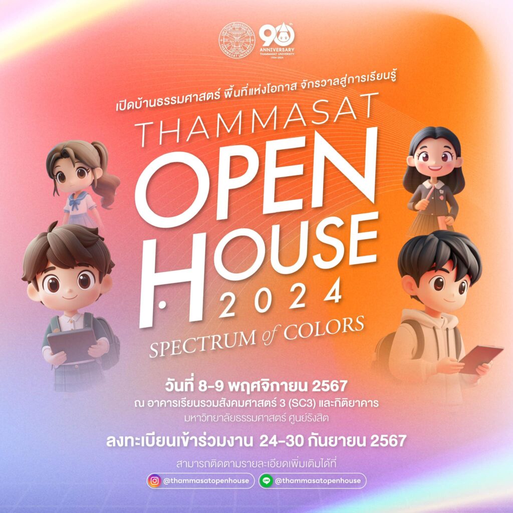 EZ Webmaster September 18, 2024 EZ Webmaster September 18, 2024 เปิดบ้านม.ธรรมศาสตร์ ค้นหาคณะที่ใช่! เตรียมพบกับ 𝐓𝐡𝐚𝐦𝐦𝐚𝐬𝐚𝐭 𝐎𝐩𝐞𝐧 𝐇𝐨𝐮𝐬𝐞 𝟐𝟎𝟐𝟒 : 𝐒𝐩𝐞𝐜𝐭𝐫𝐮𝐦 𝐨𝐟 𝐂𝐨𝐥𝐨𝐫𝐬 ”เปิดบ้านธรรมศาสตร์ : พื้นที่แห่งโอกาส จักรวาลสู่การเรียนรู้” โดยงานเปิดบ้านธรรมศาสตร์ในปีนี้ ทุกคนงานจะได้ “ค้นหาตัวตนในทุกรูปแบบ” ผ่านการสัมผัสประสบการณ์จริง พร้อมโอกาสได้แลกเปลี่ยนมุมมองผ่าน Workshop การเสวนา และการพบปะพูดคุยกับคณาจารย์ รุ่นพี่ รวมถึงเข้าร่วมกิจกรรมต่าง ๆ ที่จะช่วยเสริมสร้างความเข้าใจในตัวเอง เพื่อเตรียมความพร้อมสำหรับการก้าวเข้าสู่คณะที่ใช่ และสาขาที่ชอบได้อย่างมั่นใจและเหมาะสม สำหรับปีนี้จัดขึ้นภายใต้คอนเซ็ปท์ 𝑶𝑵𝑬 𝑻𝑼 : “𝑬𝒙𝒕𝒓𝒂𝒐𝒓𝒅𝒊𝒏𝒂𝒓𝒚 𝑼”, 𝒅𝒊𝒔𝒄𝒐𝒗𝒆𝒓 𝒕𝒉𝒆 𝒓𝒆𝒂𝒍 𝒚𝒐𝒖. SHADE OF ENDLESS OPPORTUNITY – พื้นที่แห่งการสร้างโอกาสในการเรียนรู้ที่ไม่มีที่สิ้นสุด SHADE OF NEXUS KNOWLEDGE – ศูนย์รวมที่เชื่อมต่อศาสตร์แห่งการเรียนรู้จากทุกสาขาวิชา SHADE OF EMPOWERING FUTURES – พื้นที่ในการรู้จักตัวเองและค้นหาตัวตน SHADE OF AI & TECHNOLOGY – พื้นที่สำหรับการพัฒนาองค์ความรู้ด้านเทคโนโลยี นวัตกรรมและปัญญาประดิษฐ์ SHADE OF UNITY AND UNIQUENESS – พื้นที่แห่งอัตลักษณ์และความหลากหลาย เปิดรับลงทะเบียนร่วมงานตั้งแต่วันที่ 24 – 30 กันยายน 2567 สำหรับรายละเอียดการลงทะเบียนและรายละเอียดกิจกรรมเพิ่มเติม เพื่อน ๆ สามารถติดตามได้เร็ว ๆ นี้ โดยงานจะถูกจัดขึ้นในวันที่ 8 และ 9 พฤศจิกายนนี้ ณ อาคารเรียนรวมสังคมศาสตร์ 3 (SC3) และ กิติยาคาร มหาวิทยาลัยธรรมศาสตร์ ศูนย์รังสิต ติดตามรายละเอียดเพิ่มเติม : https://www.facebook.com/thammasat.uni