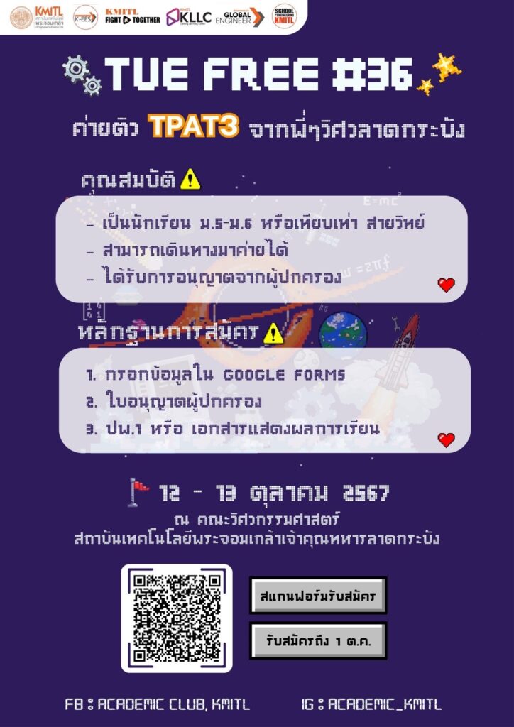 EZ Webmaster September 18, 2024 EZ Webmaster September 18, 2024 ติวฟรี! ค่ายติว PAT3 จากพี่ๆวิศวลาดกระบัง กลับมาอีกครั้งสำหรับค่าย Tue Free ครั้งที่ 36จัดทำขึ้นเพื่อน้องๆระดับชั้น ม.5 -ม.6 หรือเทียบเท่า สายวิทย์ เพื่อให้ได้รับความรู้ในการ สอบ ความถนัดด้านวิทยาศาสตร์ เทคโนโลยี และวิศวกรรมศาสตร์ (TPAT3) ซึ่งจัดสอนโดยพี่ๆจากคณะวิศวกรรมศาสตร์ สถาบันเทคโนโลยีพระจอมกล้า เจ้าคุณทหารลาดกระบัง เพื่อใช้ในการสอบเข้ามหาวิทยาลัย และภายในค่ายยังมีกิจกรรมสนุกๆอีกมากมาย หลังจบค่ายนี้พี่ๆ รับประกันว่าน้องๆจะได้ความรู้ ความสนุก และเพื่อนใหม่ๆจากค่ายแน่นอน ลิ้งค์รับสมัคร : คลิกที่นี่ รายละเอียดค่าย ระยะเวลาการจัดค่าย : 12-13 ตุลาคม 2567 ระยะเวลา 2 วัน สถานที่จัดค่าย : คณะวิศวกรรมศาสตร์ สถาบันเทคโนโลยีพระจอมเกล้าเจ้าคุณทหารลาดกระบัง ลักษณะค่าย : On-site ไม่ค้างคืน ค่าใช้จ่าย : ฟรี (มีค่าอาหาร 150 บาท ชำระหลังจากมีรายชื่อ) คุณสมบัติ เป็นนักเรียน ม.5-ม.6หรือเทียบเท่า สายวิทย์ สามารถอยู่ได้ตลอดค่าย ได้รับการอนุญาตจากผู้ปกครอง ไม่เป็นโรคติดต่อร้ายแรง ร่างกายไม่เป็นอุปสรรคต่อการมาค่าย หลักฐานการสมัคร 1. กรอกข้อมูลใน Google forms 2. ใบอนุญาตผู้ปกครอง 3. ปพ.1 หรือ เอกสารแสดงผลการเรียน (ถ้าขอไม่ทันให้ทักมาทางเพจ) สามารถสมัครได้ตั้งแต่วันนี้ถึง 1 ตุลาคม 2567 * ติดต่อสอบถามได้ที่เพจ : Academic Club, KMITL IG : academic_kmitl