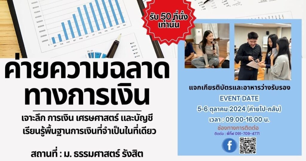 EZ Webmaster September 23, 2024 EZ Webmaster September 23, 2024 รวมค่าย บัญชี บริหาร เก็บเกียรติบัตร สำหรับDEK68 รวมค่ายสายบัญชีบริหาร สำหรับน้องๆที่สนใจอยากเข้าร่วมเพื่อประสบการณ์ด้านบัญชีบริหาร ค่ายที่จะพาน้องๆไปร่วมสนุกกับกิจกรรมที่มอบประสบการณ์ และสาระความรู้แบบจัดเต็ม Business Developer ค่ายธุรกิจ บริหาร บัญชี และการตลาด วันที่จัดกิจกรรม อาทิตย์ 6 ตุลาคม 2567 วันที่รับสมัครวันสุดท้าย ศุกร์ 4 ตุลาคม 2567 จำนวนที่รับ 25-35 คน ค่าใช้จ่าย 2,950 บาท บาท คุณสมบัติ ม.3 – ม.6 / ปวช. / ปวส. (ปีการศึกษา 2567) อายุ 14 – 19 ปี สถานที่จัดกิจกรรม True Space Asoke รายละเอียด : https://www.camphub.in.th ค่ายความฉลาดทางการเงิน วันที่จัดกิจกรรม เสาร์ 5 – อาทิตย์ 6 ตุลาคม 2567 วันที่รับสมัครวันสุดท้าย พฤหัส 3 ตุลาคม 2567 จำนวนที่รับ 50 คน ค่าใช้จ่าย 2,499 บาท คุณสมบัติ ระดับการศึกษาม.ปลาย (ปีการศึกษา 2567) สถานที่จัดกิจกรรม ม. ธรรมศาสตร์ รังสิต รายละเอียด : https://www.camphub.in.th One Million Business ค่ายบริหารธุรกิจ | บัญชี | โลจิสติกส์ กิจกรรมออนไลน์ วันที่จัดกิจกรรม อาทิตย์ 29 กันยายน 2567 จำนวนที่รับ 100 คน ค่าใช้จ่าย 469 บาท คุณสมบัติ ระดับการศึกษา ม.1 – ม.6 / ปวช.หรือเทียบเท่า / เด็กซิ่ว (ปีการศึกษา 2568) รายละเอียด : https://www.camphub.in.th/ Biz Camp3: เปิดโลกธุรกิจสำหรับมือใหม่ กิจกรรมออนไลน์ ค่ายออนไลน์ที่ Google Classroom วันที่จัดกิจกรรม เสาร์ 28 กันยายน 2567 จำนวนที่รับ 50 ค่าใช้จ่าย 799 บาท คุณสมบัติ ระดับการศึกษา ม.1 – ม.6 / บุคคลทั่วไป (ปีการศึกษา 2568) บุคคลที่สนใจเรื่องธุรกิจ รายละเอียด : https://www.camphub.in.th SIFE MasterClass Sustainability Expo 2024 วันที่จัดกิจกรรม อาทิตย์ 6 ตุลาคม 2567 จำนวนที่รับ 80 คน ค่าใช้จ่าย ฟรี คุณสมบัติ ระดับการศึกษา ม.ปลาย (ปีการศึกษา 2567) สถานที่จัดกิจกรรม ศูนย์การประชุมแห่งชาติสิริกิติ์ (QSNCC) รายละเอียด : https://www.camphub.in.th ขอบคุณข้อมูลจาก : CAMPHUBth