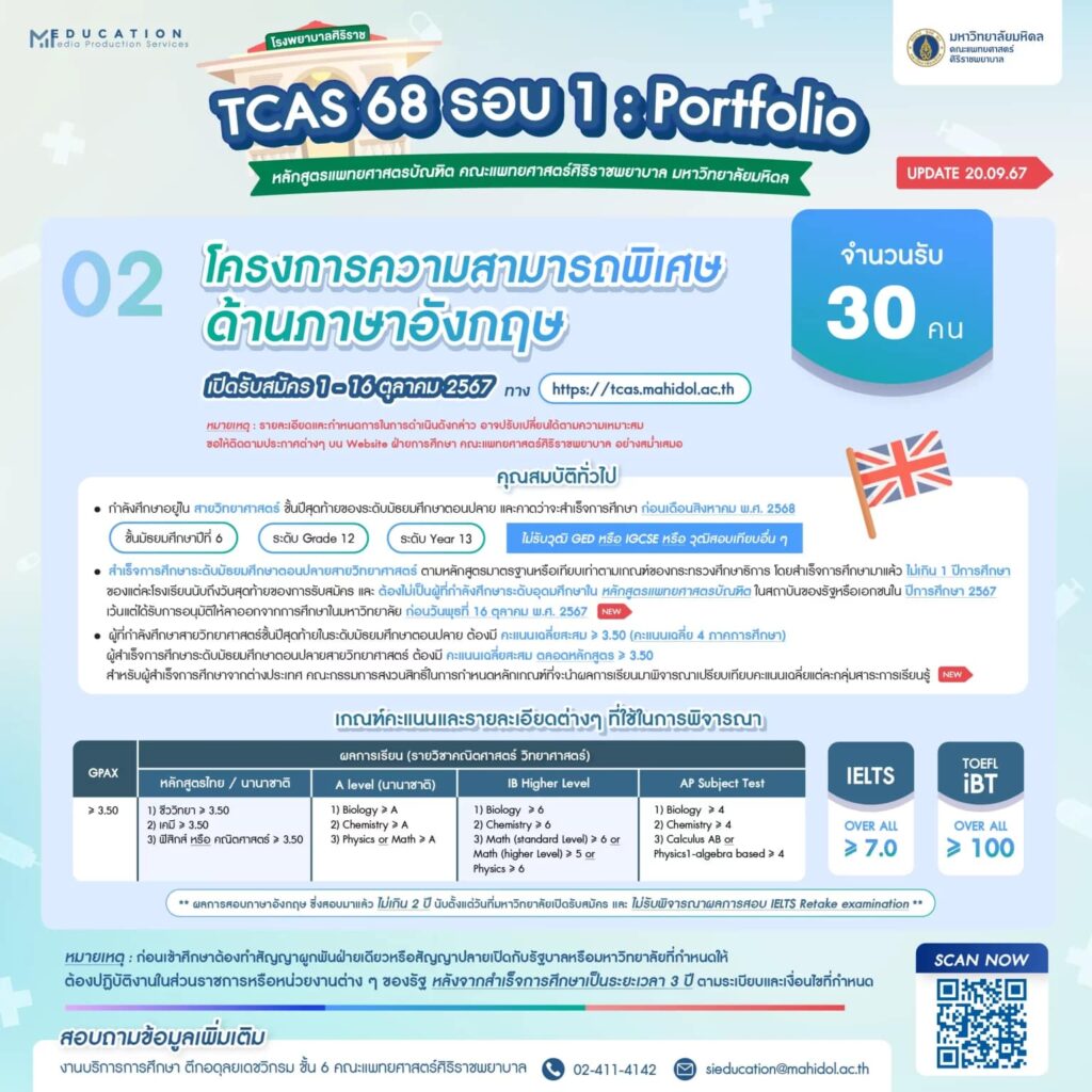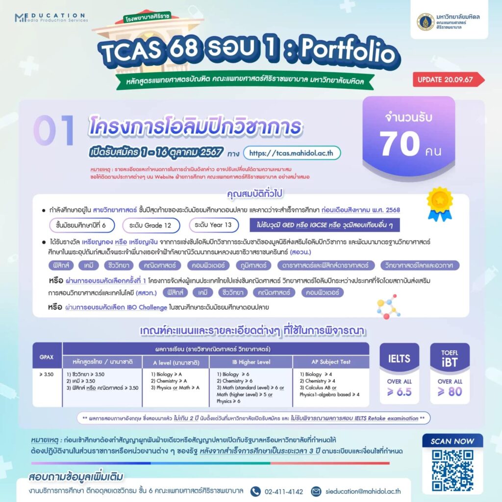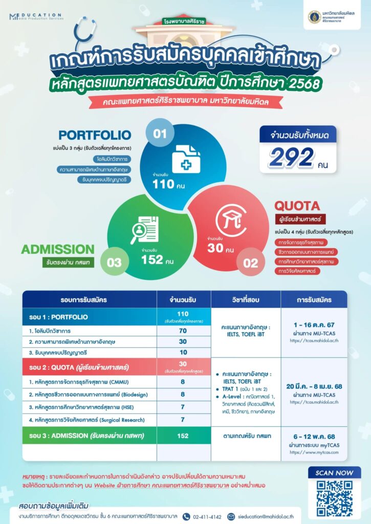 EZ Webmaster September 24, 2024 EZ Webmaster September 24, 2024 คณะแพทยศาสตร์ศิริราชพยาบาล ประกาศจำนวนรับและเกณฑ์การรับสมัครแล้วTCAS68 คณะแพทยศาสตร์ศิริราชพยาบาล ประกาศจำนวนรับและเกณฑ์การรับสมัครเข้าศึกษา หลักสูตรแพทยศาสตรบัณฑิต ผ่าน TCAS68 จำนวนรับรวม 292 คน – รอบที่ 1 Portfolio จำนวน 110 คน – รอบที่ 2 โควตา จำนวน 30 คน – รอบที่ 3 Admission จำนวน 152 คน กำหนดการรับสมัคร รอบที่ 1 #Portfolio วันที่ 1-16 ต.ค.67 สมัครกับ มหิดล ที่ https://tcas.mahidol.ac.th คณะแพทยศาสตร์ศิริราชพยาบาล ประกาศ เกณฑ์การรับสมัคร เข้าศึกษา หลักสูตรแพทยศาสตรบัณฑิต ผ่าน TCAS68 รอบที่ 1 Portfolio จำนวนรับรวม 110 คน โครงการโอลิมปิกวิชาการ จำนวน 70 คน (รับ ม.6 #dek68 ความสามารถพิเศษด้านภาษาอังกฤษ จำนวน 30 คน (รับ ม.6 #dek68 และ #เด็กซิ่ว เฉพาะ #dek67) รับบุคคลจบปริญญาตรี จำนวน 10 คน เลือกสมัครได้ 1 โครงการ รับสมัคร วันที่ 1-16 ต.ค.67 ที่ https://tcas.mahidol.ac.th/ รอบที่ 2 โควตา วันที่ 20 มี.ค.68-8 เม.ย.68 สมัครกับ มหิดล ที่https://tcas.mahidol.ac.th รอบที่ 3 Admission วันที่ 6-12 พ.ค.68 สมัครกับ ทปอ. ที่ https://www.mytcas.com