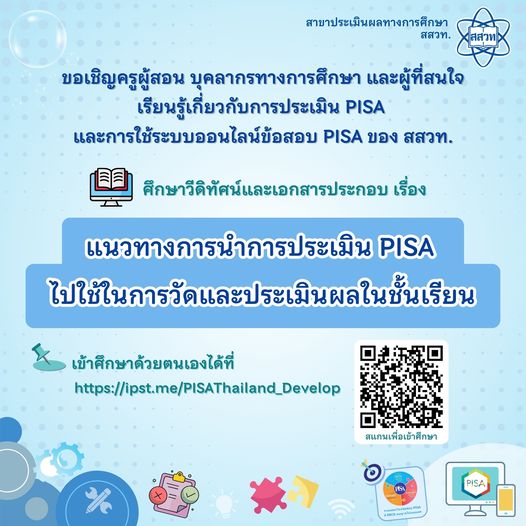 EZ Webmaster September 26, 2024 EZ Webmaster September 26, 2024 สสวท. ชวนเรียนรู้แนวทางนำ PISA ไปใช้วัดและประเมินผลในชั้นเรียน สถาบันส่งเสริมการสอนวิทยาศาสตร์และเทคโนโลยี (สสวท.) เชิญครู และบุคลากรการศึกษา เรียนรู้เกี่ยวกับการประเมิน PISA ซึ่งเน้นการประเมินสมรรถนะของนักเรียนที่เรียกว่า ความฉลาดรู้ (Literacy) ใน 3 ด้าน ได้แก่ ด้านการอ่าน ด้านคณิตศาสตร์ และด้านวิทยาศาสตร์ รวมทั้งศึกษาการใช้ระบบออนไลน์ข้อสอบ PISA ซึ่งเป็นระบบสารสนเทศที่ สสวท.พัฒนาขึ้นเพื่อเผยแพร่ข้อสอบ PISA ที่ได้รับอนุญาตให้เผยแพร่แล้ว และข้อสอบที่พัฒนาโดย สสวท. เพื่อเรียนรู้แนวทางนำการประเมิน PISA ไปใช้วัดและประเมินผลในชั้นเรียนได้ ดาวน์โหลดเอกสารพร้อมวีดิทัศน์รายละเอียดที่เว็บไซต์ https://pisathailand.ipst.ac.th/ea-ipst-training-vids