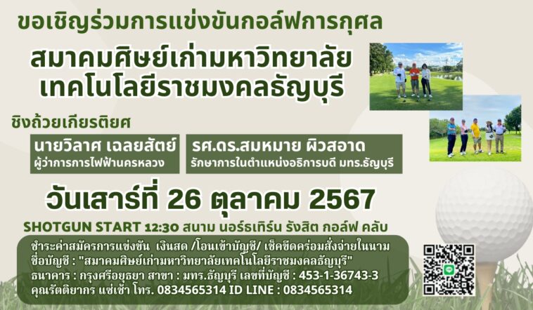 tui sakrapee September 10, 2024 สมาคมศิษย์เก่า มทร.ธัญบุรี ขอเชิญร่วมกอล์ฟการกุศล สนับสนุนการศึกษาและสังคม tui sakrapee September 10, 2024 นายวิลาศ เฉลยสัตย์ นายกสมาคมศิษย์เก่า มหาวิทยาลัยเทคโนโลยีราชมงคลธัญบุรี (มทร.ธัญบุรี) เปิดเผยว่า มทร.ธัญบุรี ร่วมกับ สมาคมศิษย์เก่า มทร.ธัญบุรี จัดกิจกรรมสำคัญการแข่งขันกอล์ฟการกุศล เพื่อสนับสนุนด้านการศึกษาและด้านสังคม รายได้จากกิจกรรมดังกล่าวจะนำไปใช้เป็นทุนการศึกษาเพื่อมอบให้กับนักศึกษา มทร.ธัญบุรี และนักเรียนโรงเรียนสาธิตนวัตกรรม มทร.ธัญบุรี รวมถึงสนับสนุนกิจกรรมของมหาวิทยาลัย และสมาคมศิษย์ มทร.ธัญบุรี จึงขอเชิญชวนผู้สนใจกีฬากอล์ฟและประชาชนทั่วไปเข้าร่วมกิจกรรม “การแข่งขันกอล์ฟการกุศล” ในวันเสาร์ที่ 26 ต.ค. 2567 ณ สนามนอร์ธเทิร์น รังสิต กอล์ฟ คลับ (NORTHERN… Continue Reading