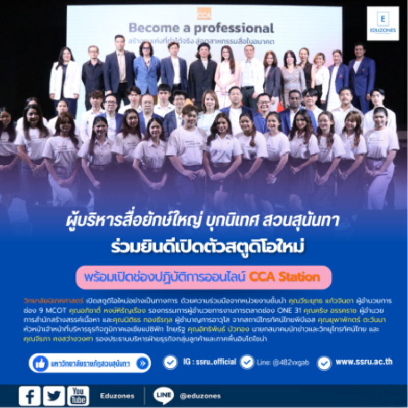 tui sakrapee September 11, 2024 ผู้บริหารสื่อยักษ์ใหญ่ บุกนิเทศ สวนสุนันทา ร่วมยินดีเปิดตัวสตูดิโอใหม่ พร้อมเปิดช่องปฏิบัติการออนไลน์ CCA Station tui sakrapee September 11, 2024 ผู้บริหารสื่อยักษ์ใหญ่ ร่วมแสดงความยินดีงานเปิดตัวสตูดิโอใหม่ พร้อมเปิดช่องปฏิบัติการออนไลน์ CCA Station แน่นสตูวิทยาลัยนิเทศศาสตร์ วันที่ 10 กันยายน 2567 วิทยาลัยนิเทศศาสตร์ เปิดสตูดิโอใหม่อย่างเป็นทางการ ด้วยความร่วมมือจากหน่วยงานภาคเอกชนระดับชาติ คุณวีระยุทธ แก้วจินดา ผู้อำนวยการช่อง 9 MCOT คุณอภิชาติ์ หงษ์หิรัญเรือง รองกรรมการผู้อำนวยการงานการตลาดช่อง ONE 31 คุณคริษ อรรคราช ผู้อำนวยการสำนักสร้างสรรค์เนื้อหา และคุณนิติธร ทองธีรกุล ผู้ชำนาญการอาวุโส จากสถานีโทรทัศน์ไทยพีบีเอส คุณยุพาพักตร์ ตะวันนา… Continue Reading