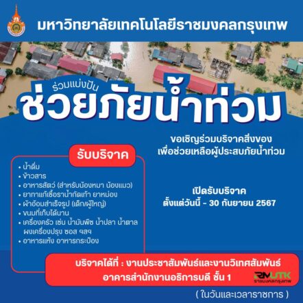 tui sakrapee September 15, 2024 มหาวิทยาลัยเทคโนโลยีราชมงคลกรุงเทพ ขอเชิญร่วมบริจาคสิ่งของ ช่วยเหลือผู้ประสบภัยน้ำท่วม tui sakrapee September 15, 2024 มหาวิทยาลัยเทคโนโลยีราชมงคลกรุงเทพ ขอเชิญร่วมบริจาคสิ่งของ ช่วยเหลือผู้ประสบภัยน้ำท่วม เปิดรับบริจาค • น้ำดื่ม • ข้าวสาร • อาหารสัตว์ (สําหรับน้องหมา น้องแมว) • ยาทาแก้เชื้อราน้ำกัดเท้า ยาหม่อง • ผ้าอ้อมสําเร็จรูป (เด็ก/ผู้ใหญ่) • ขนมที่เก็บได้นาน • เครื่องครัว เช่น น้ำมันพืช น้ำปลา น้ำตาล ผงเครื่องปรุง ซอส ฯลฯ • อาหารแห้ง อาหารกระป๋อง… Continue Reading