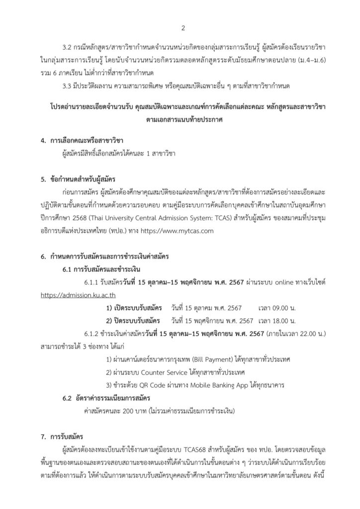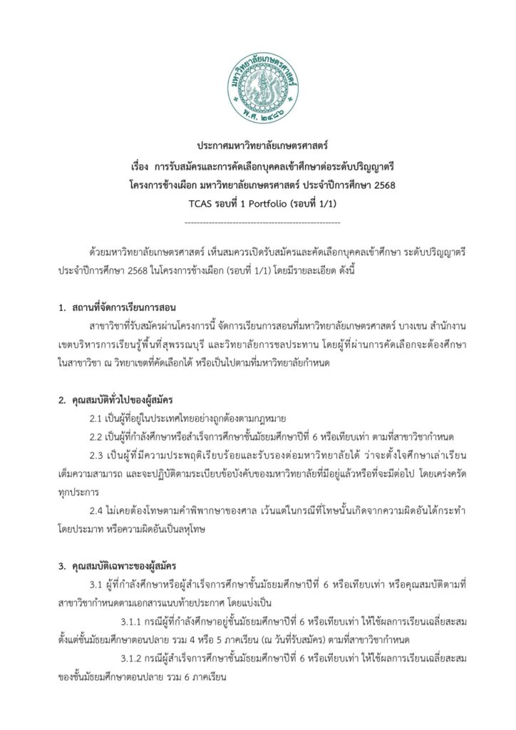 EZ Webmaster October 1, 2024 EZ Webmaster October 1, 2024 ม.เกษตรศาสตร์ รับสมัครTCAS รอบที่ 1 โครงการช้างเผือก รวม 14 คณะ มหาวิทยาลัยเกษตรศาสตร์ รับสมัครเข้าศึกษาผ่านTCAS รอบที่ 1 PORTFOLIO โครงการช้างเผือก (รอบที่ 1/1) เปิดรับรวม 14 คณะ คณะเกษตร คณะประมง คณะวนศาสตร์ คณะวิทยาศาสตร์ คณะวิศวกรรมศาสตร์ คณะสังคมศาสตร์ คณะอุตสาหกรรมเกษตร คณะมนุษยศาสตร์ คณะบริหารธุรกิจ คณะสิ่งแวดล้อม วิทยาลัยบูรณาการศาสตร์ คณะแพทยศาสตร์ คณะพยาบาลศาสตร์ คณะสหวิทยาการและเทคโนโลยี (จ.สุพรรณบุรี) เลือกสมัครได้ 1 สาขา รับสมัคร วันที่ 15 ต.ค.67 – 15 พ.ย.67 ที่ https://admission.ku.ac.th