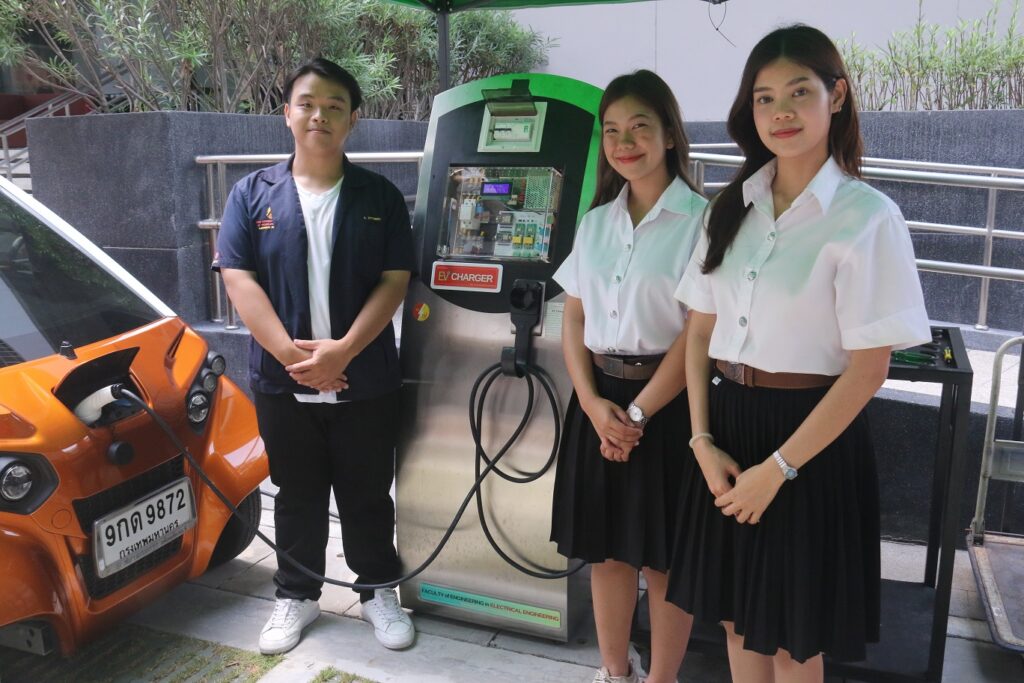 EZ Webmaster October 16, 2024 EZ Webmaster October 16, 2024 EV Charger มาตรฐานสากล ผลงานเด็กวิศวะไฟฟ้า มจธ. หนึ่งในสิ่งจำเป็นสำหรับเจ้าของรถยนต์ EV ก็คือเครื่องชาร์จรถยนต์ไฟฟ้า หรือ EV Charger ที่จะทำหน้าที่อัดประจุไฟฟ้าให้กับแบตเตอรี่ในรถยนต์ EV ซึ่งในอนาคตหากจำนวนรถ EV เพิ่มมากขึ้น ความต้องการติดตั้ง EV Charger ในที่พักอาศัยและอาคารก็จะมีมากขึ้น ทั้งเพื่อใช้กับรถยนต์ EV คันใหม่ หรือทดแทน EV Charger เครื่องเก่าที่ชำรุดเสียหาย แต่ EV Charger ที่ค่ายรถนำมาติดตั้งให้กับผู้ซื้อรถ รวมถึงที่จำหน่ายในร้านค้าและออนไลน์ ล้วนเป็นของนำเข้าจากต่างประเทศ ที่ผู้ซื้อส่วนใหญ่ก็ยากที่จะทราบว่า EV Charger เครื่องนั้นมีมาตรฐานและความปลอดภัยในการใช้งานมากน้อยเพียงใด เพราะประเทศไทยยังไม่มีการออกมาตรฐานตัว EV Charger ติดบ้าน หนึ่งในก้าวเล็กๆ ของแนวทางนี้ก็คือ ตู้ EV Charger ผลงานของ 3 นักศึกษาปริญญาตรี คณะวิศวกรรมศาสตร์ มหาวิทยาลัยเทคโนโลยีพระจอมเกล้าธนบุรี (มจธ.) ประกอบด้วย นางสาวพลอยพรรณ สุขประเสริฐ (น้องเนย), นายสิทธิเดช สุนันทโชติหิรัญ (น้องที) และนางสาวอิสระยา แก่นแก้ว (น้องแอล) ภายใต้โปรเจกต์ปี 4 ในหัวข้อ “การออกแบบและสร้างเครื่องอัดประจุแบตเตอรี่สำหรับยานยนต์ไฟฟ้า” นายสิทธิเดช หรือน้องที กล่าวถึงที่มาของงานนี้ว่า ตนเองและเพื่อนได้มีโอกาสดูคลิปการทำ EV Charger สำหรับรถยนต์ EV ของช่างไทย ที่อาจารย์ที่ปรึกษาส่งมาให้ดูตอนเรียนอยู่ปี 3 เทอม 2 จึงปรึกษาอาจารย์ว่าความรู้ด้านวิศวกรรมไฟฟ้าที่เรียนมา 3 ปี และในปี 4 จะสามารถนำมาสร้างกล่องแผงวงจรเพื่อควบคุมการจ่ายไฟให้รถยนต์ EV ได้หรือไม่ จนเกิดเป็นโปรเจกต์ตอนปี 4 ขึ้นมา โดยความคาดหวังของพวกเราตอนนั้นคือ อยากจะสร้างแผงวงจรที่สามารถควบคุมการชาร์จไฟฟ้ากระแสสลับที่ได้มาตรฐานเดียวกับกล่อง EV Charger ที่มีจำหน่ายในท้องตลาด “ในกล่อง EV Charger ที่มีในท้องตลาดนั้น จะต้องมีทั้งวงจรป้องกันไฟรั่ว ระบบสายดิน ระบบควบคุมแรงดันไฟฟ้า ระบบสื่อสารสัญญาณเพื่อตรวจสอบสถานการณ์ชาร์จ และระบบตัดไฟเมื่อพบปัญหา ซึ่งจะมีมาตรฐานสากลของแต่ละระบบกำหนดไว้อย่างชัดเจน ดังนั้นในการออกแบบและสร้างแผงวงจรเพื่อควบคุมระบบเหล่านี้ จึงมีเป้าหมายคือการปรับแต่งให้ค่าสัญญาณต่างๆ ที่เกิดขึ้นระหว่างการทดลองชาร์จประจุเป็นไปตามมาตรฐานสากล (J1772) โดยในปี 4 เทอม 1 จะเป็นการศึกษาด้วยการจำลอง (Simulation) ผ่านโปรแกรม ก่อนที่จะมีการสร้างแผงวงจรและทดสอบจริงในเทอมที่ 2 ซึ่งในส่วนของผมรับผิดชอบด้านฮาร์ดแวร์ เช่น การทําแผ่นพรินท์ (PCB) เป็นหลัก” ด้านนางสาวอิสริยา หรือน้องแอล ผู้ทำหน้าที่เขียนโค้ดและซอฟต์แวร์ กล่าวถึงกา