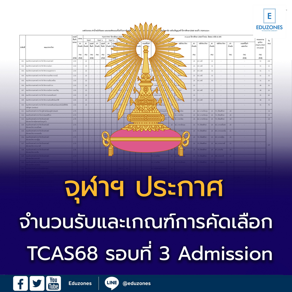 EZ Webmaster October 18, 2024 EZ Webmaster October 18, 2024 จุฬาฯ ประกาศ จำนวนรับและเกณฑ์การคัดเลือก TCAS68 รอบที่ 3 Admission จุฬาฯ ประกาศ จำนวนรับและเกณฑ์การคัดเลือก ผ่าน #TCAS68 รอบที่ 3 #Admission คณะที่เปิดรับ – คณะวิศวกรรมศาสตร์ – คณะอักษรศาสตร์ – คณะวิทยาศาสตร์ – คณะรัฐศาสตร์ – คณะสถาปัตยกรรมศาสตร์ – คณะพาณิชศาสตร์และการบัญชี – คณะเศรษฐศาสตร์ – คณะครุศาสตร์ – คณะนิเทศศาสตร์ – คณะนิติศาสตร์ – คณะสหเวชศาสตร์ – คณะจิตวิทยา – คณะวิทยาศาสตร์การกีฬา – สำนักวิชาทรัพยากรการเกษตร รับสมัคร วันที่ 6-12 พ.ค.68 สมัครกับ ทปอ. ที่ mytcas.com เพิ่มเติมที่ https://admission.chula.ac.th/