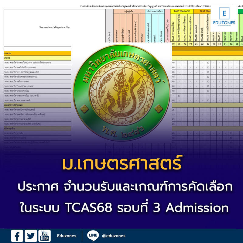 EZ Webmaster October 24, 2024 EZ Webmaster October 24, 2024 ม.เกษตรศาสตร์ ประกาศ จำนวนรับและเกณฑ์การคัดเลือกในระบบ TCAS68 รอบที่ 3 Admission ม.เกษตรศาสตร์ ประกาศ จำนวนรับและเกณฑ์การคัดเลือกในระบบ TCAS68 รอบที่ 3 Admission คณะที่เปิดรับ – คณะเกษตร – คณะประมง – คณะวนศาสตร์ – คณะวิทยาศาสตร์ – คณะวิศวกรรมศาสตร์ – คณะศึกษาศาสตร์ – คณะเศรษฐศาสตร์ – คณะสังคมศาสตร์ – คณะสัตวแพทยศาสตร์ – คณะอุตสาหกรรมเกษตร – คณะมนุษยศาสตร์ – คณะบริหารธุรกิจ – คณะเทคนิคการสัตวแพทย์ – คณะสถาปัตยกรรมศาสตร์ – คณะสิ่งแวดล้อม – วิทยาลัยบูรณาการศาสตร์ – วิทยาลัยการชลประทาน – คณะพยาบาลศาสตร์ – คณะเกษตร กำแพงแสน – คณะวิศวกรรมศาสตร์ กำแพงแสน – คณะศึกษาศาสตร์และพัฒนศาสตร์ – คณะศิลปศาสตร์และวิทยาศาสตร์ – คณะวิทยาศาสตร์การกีฬาและสุขภาพ – คณะอุตสาหกรรมบริการ – คณะเศรษฐศาสตร์ ศรีราชา – คณะพาณิชยนาวีนานาชาติ – คณะวิทยาการจัดการ – คณะวิทยาศาสตร์ ศรีราชา – คณะวิศวกรรมศาสตร์ ศรีราชา – คณะทรัพยากรธรรมชาติและอุตสาหกรรมเกษตร – คณะวิทยาศาสตร์และวิศวกรรมศาสตร์ – คณะศิลปศาสตร์และวิทยาการจัดการ – คณะสาธารณสุขศาสตร์ – คณะสหวิทยาการจัดการและเทคโนโลยี รับสมัคร วันที่ 6-12 พ.ค.68 สมัครกับ ทปอ. ที่ https://www.mytcas.com เพิ่มเติมที่ https://admission.ku.ac.th