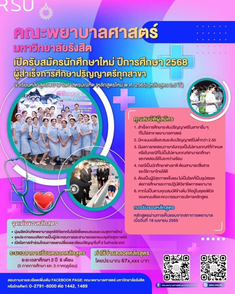 EZ Webmaster October 29, 2024 EZ Webmaster October 29, 2024 คณะพยาบาลฯ ม.รังสิต เปิดรับสมัครหลักสูตรพยาบาลศาสตรบัณฑิต (ต่อเนื่อง 2.5 ปี) คณะพยาบาลศาสตร์ มหาวิทยาลัยรังสิต เปิดรับสมัครนักศึกษาใหม่ ปีการศึกษา 2568 ผู้สำเร็จการศึกษาปริญญาตรีทุกสาขา เข้าเรียนหลักสูตรพยาบาลศาสตรบัณฑิต (หลักสูตรใหม่ พ.ศ. 2565) (ต่อเนื่อง 2.5 ปี) ระยะเวลาศึกษา 2 ปี 6 เดือน (5 ภาคการศึกษา และ 3 ภาคฤดูร้อน) โดยมีคุณสมบัติดังนี้ สำเร็จการศึกษาระดับปริญญาตรีในสาขาอื่น ๆ ที่ไม่ใช่สาขาพยาบาลศาสตร์ มีคะแนนเฉลี่ยสะสมระดับปริญญาตรีไม่ต่ำกว่า 2.50 มีผลการทดสอบภาษาอังกฤษเป็นไปตามเกณฑ์ที่กำหนดหรือในกรณีที่ไม่เป็นไปตามเกณฑ์สามารถศึกษาและทดสอบได้ในระหว่างเรียน กรณีเป็นนักศึกษาต่างชาติ ต้องสามารถสื่อสารและใช้ภาษาไทยได้ ต้องเป็นผู้มีสุขภาพแข็งแรง ไม่เป็นโรคที่เป็นอุปสรรคต่อการศึกษาและการปฏิบัติวิชาชีพการพยาบาล หากไม่เป็นตามคุณสมบัติข้างต้น ให้อยู่ในดุลยพินิจของคณบดีและคณะกรรมการบริหารหลักสูตร สำหรับผู้ที่สนใจสามารถสอบถามรายละเอียดเพิ่มเติมได้ที่ Facebook Page: คณะพยาบาลศาสตร์ มหาวิทยาลัยรังสิต โทร. 0-2791-6000 ต่อ 1442, 1489 หรือสมัคร online ได้ที่ https://admissiononline.rsu.ac.th/regisBachelor/RegisBachelor