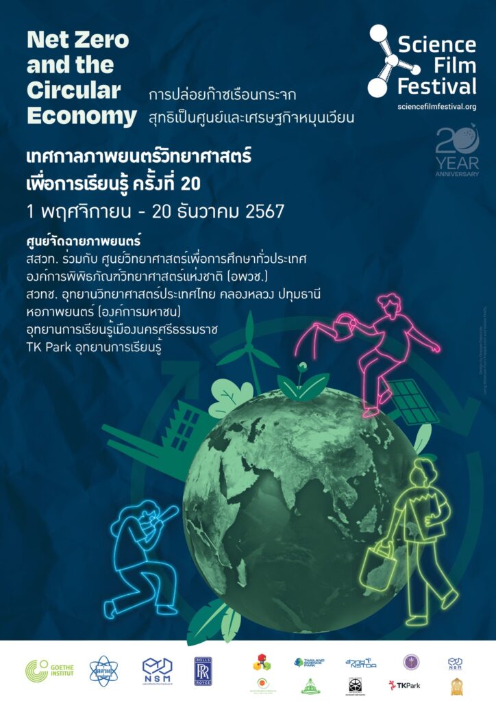 EZ Webmaster November 7, 2024 EZ Webmaster November 7, 2024 สองทศวรรษร่วมจัดร่วมใจ จุดประกายเยาวชนไทย เทศกาลภาพยนตร์วิทยาศาสตร์เพื่อการเรียนรู้ ครั้งที่ 20 หากเธอคือ “กล้าไม้”..…จำเนียรกาลผ่านไปก็เจริญวัยเป็น “ไม้ใหญ่” ที่แผ่กิ่งก้านสาขาให้ร่มเงา ชวนชมดอกผลร่มรื่นชื่นใจ ใต้ร่มไม้กิ่งใบยังมีเด็ก ๆ วิ่งเล่นกันเกรียวกราว ซึ่งต่อมาต่างก็ทยอยกัน เป็นหนุ่ม เป็นสาว เติบโตพัฒนาไปตามเส้นทางสู่อนาคต สองทศวรรษเต็ม ๆ ที่เธออยู่คู่กับการศึกษาไทย ทอดตาดูเยาวชนวัยใสที่เคยตื่นตาตื่นใจกับเธอ บัดนี้พวกเขาส่วนหนึ่งได้ เติบใหญ่เป็นกำลังสำคัญที่ขับเคลื่อนอนาคตชาติในทุกภาคส่วนแล้ว ใช่เลย “เธอ” ผู้นั้น…“เทศกาลภาพยนตร์วิทยาศาสตร์เพื่อการเรียนรู้ หรือ Science Film Festival” เพราะเพียงลัดนิ้วมือเดียวเทศกาลนี้ก็โลดแล่นต่อเนื่องมาถึงหลักปีที่ 20 แล้วจากการผนึกความร่วมมือกันของ สถาบันส่งเสริมการสอนวิทยาศาสตร์และเทคโนโลยี (สสวท.) กระทรวงศึกษาธิการ สถาบันเกอเธ่ ประเทศไทย องค์การพิพิธภัณฑ์วิทยาศาสตร์แห่งชาติ (อพวช.) และหน่วยงานหลักร่วมจัดแห่งต่าง ๆ นำภาพยนตร์วิทยาศาสตร์คุณภาพจากนานาชาติมาจัดฉายให้ชมฟรี เพื่อสร้างความตระหนักในการเรียนรู้วิทยาศาสตร์ให้เยาวชนไทย ส่งเสริมให้เห็นความสำคัญของวิทยาศาสตร์ที่มีต่อชีวิต และ สิ่งแวดล้อม ยกระดับสังคมไทยให้เข้มแข็งด้วยวิทยาศาสตร์ทั้งแนวคิดและการดำเนินชีวิต ล่าสุดปีนี้เทศกาลภาพยนตร์วิทยาศาสตร์เพื่อการเรียนรู้ ครั้งที่ 20 เดินเครื่องจัดแล้วระหว่างวันที่ 1 พฤศจิกายน – 20 ธันวาคม 2567 ภายใต้แนวคิด“การปล่อยก๊าซเรือนกระจกสุทธิเป็นศูนย์และเศรษฐกิจหมุนเวียน (Net Zero and the Circular Economy) โดยโฟกัสที่หัวข้อ Net Zero หรือการปล่อยก๊าซเรือนกระจกสุทธิเป็นศูนย์และเศรษฐกิจหมุนเวียน ซึ่งเน้นบทบาทสำคัญของแนวคิดการปล่อยก๊าซเรือนกระจกสุทธิเป็นศูนย์ และเศรษฐกิจหมุนเวียน ในการต่อสู้กับความท้าทายที่เกิดจากวิกฤต สภาพภูมิอากาศ ไตร่ตรองมองเห็นคุณค่าของ เศรษฐกิจหมุนเวียน ซึ่งให้ความสำคัญกับการแบ่งปัน การให้เช่า การนำกลับมาใช้ใหม่ การซ่อมแซม รีไซเคิลวัสดุ ส่งเสริมการนำกลับมาใช้ใหม่และการรีไซเคิลผลิตภัณฑ์ ชะลอการสูญเสียทรัพยากรธรรมชาติ และรักษาความหลากหลายทางชีวภาพเพื่อโลกและการดำรงอยู่ของมนุษย์ เทศกาลฯปีนี้มาพร้อมกับภาพยนตร์วิทยาศาสตร์จำนวน 31 เรื่อง จาก 11 ประเทศ ประกอบด้วย 4 หมวดน่าชม คือ ภาพยนตร์การศึกษาในครอบครัว ภาพยนตร์ไร้เสียงและเกร็ดวิทยาศาสตร์ ภาพยนตร์วิทยาศาสตร์ธรรมชาติ วิทยาศาสตร์และเทคโนโลยีชีวิต และ ภาพยนตร์นิเวศวิทยาและสิ่งแว
