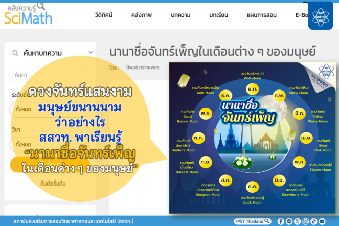 EZ Webmaster November 19, 2024 ดวงจันทร์แสนงามมนุษย์ขนานนามว่าอย่างไร สสวท. พาเรียนรู้ “นานาชื่อจันทร์เพ็ญในเดือนต่าง ๆ ของมนุษย์” EZ Webmaster November 19, 2024 สถาบันส่งเสริมการสอนวิทยาศาสตร์และเทคโนโลยี (สสวท.) พารอบรู้กับ “นานาชื่อจันทร์เพ็ญในเดือนต่าง ๆ ของมนุษย์” บทความเพิ่มพูนความรู้เกี่ยวกับจันทร์เพ็ญในประเทศไทย และจันทร์เพ็ญของเดือนสำคัญในทางพระพุทธศาสนา เปิดประสบการณ์กว้างไกลกับชื่อของดวงจันทร์ในแต่ละวัฒนธรรมที่ขนานนามแตกต่างกันออกไปในแต่ละภูมิภาคของโลก รวมทั้งชื่อเรียกขานจากชนเผ่าต่างๆ อาทิ ดวงจันทร์สุนัขจิ้งจอก ดวงจันทร์แห่งความหิว ดวงจันทร์เก็บเกี่ยว ดวงจันทร์สตรอเบอร์รี่ เติมความรู้กันได้ที่ คลังความรู้ SciMath สสวท. https://www.scimath.org/article-earthscience/item/12605-2022-07-25-08-20-30-9 Continue Reading