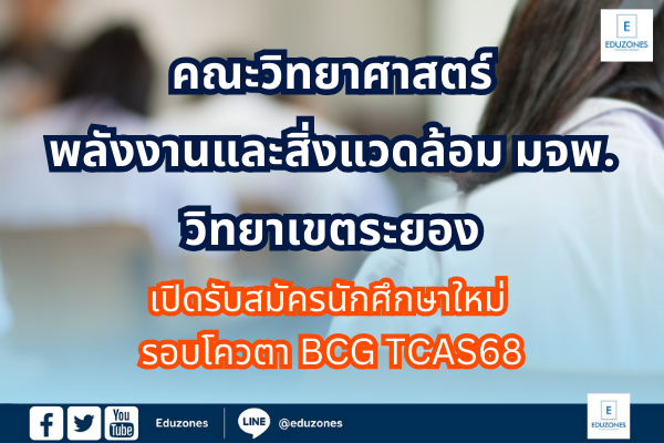 EZ Webmaster December 4, 2024 EZ Webmaster December 4, 2024 คณะวิทยาศาสตร์ พลังงานและสิ่งแวดล้อม มจพ. วิทยาเขตระยอง เปิดรับสมัครนักศึกษาใหม่ รอบโควตา BCG TCAS68 คณะวิทยาศาสตร์ พลังงานและสิ่งแวดล้อม มจพ. วิทยาเขตระยอง เปิดรับสมัครนักศึกษาใหม่ รอบโควตา BCG TCAS68 คณะวิทยาศาสตร์ พลังงานและสิ่งแวดล้อม มหาวิทยาลัยเทคโนโลยีพระจอมเกล้าพระนครเหนือ วิทยาเขตระยอง เปิดรับสมัครนักศึกษาเพื่อเข้าศึกษาต่อในระดับปริญญาตรี 4 ปี หลักสูตรวิทยาศาสตรบัณฑิต โครงการโควตาผลิตบัณฑิตเพื่อรองรับอุตสาหกรรมเศรษฐกิจ BCG model ประจำปีการศึกษา 2568 ระดับชั้นมัธยมศึกษาตอนปลาย (ม.6) หรือระดับประกาศนียบัตรวิชาชีพ (ปวช.) รับสมัครตั้งแต่ วันนี้ – 6 ธันวาคม 2567 เท่านั้น สาขาวิชาที่เปิดรับ 1. สาขาวิชากระบวนการอุตสาหกรรมเคมีและสิ่งแวดล้อม (CIPE) 2. สาขาวิชาเทคโนโลยีพลังงานและการจัดการธุรกิจอุตสาหกรรมในยุคดิจิทัล เปิดรับสมัคร 2 แขนงวิชาได้แก่ แขนงวิชาเทคโนโลยีการจัดการพลังงานอุตสาหกรรม (ETAM-IEM) และแขนงวิชาเทคโนโลยีนวัตกรรมพลังงานไฟฟ้า (ETAM-EEI) 3. สาขาวิชาวิทยาการข้อมูลและการคำนวณเชิงธุรกิจและอุตสาหกรรม (DSCBI) 4. สาขาวิชาเทคโนโลยีดิจิทัลและธุรกิจอัจฉริยะ (DTBI) สมัครได้ทุกแผนการเรียนและตรวจสอบคุณวุฒิได้ที่ https://stdadmis2.kmutnb.ac.th/Information/GradCondCheck รายละเอียดหลักสูตร www.sciee.kmutnb.ac.th สมัครออนไลน์ได้ที่ https://www.admission.kmutnb.ac.th/ สอบถามรายละเอียด โทร. 038-627000 ต่อ 5412, 5413 ในวันเวลาราชการ