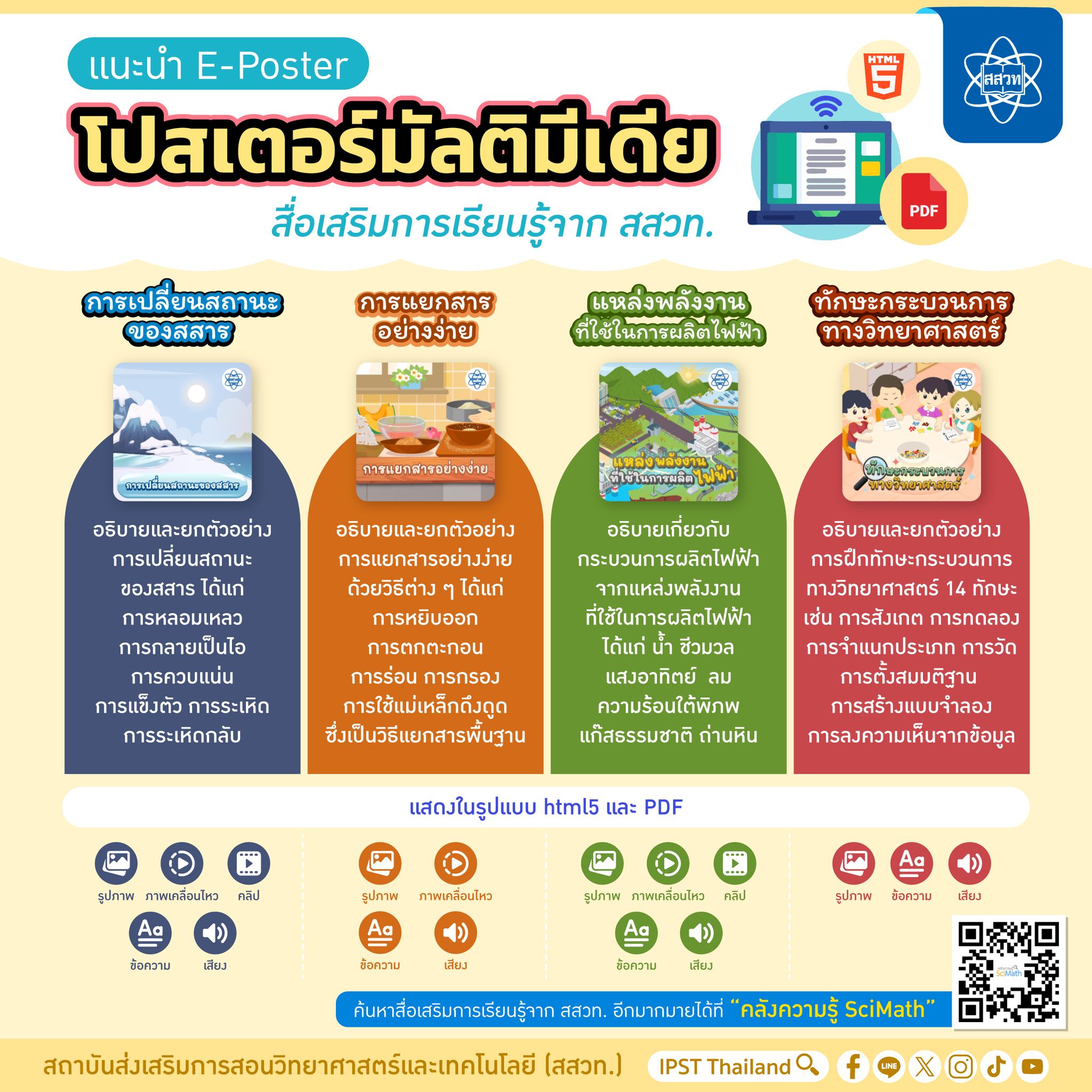 EZ Webmaster December 11, 2024 EZ Webmaster December 11, 2024 คลังความรู้ สสวท.ชวนดาวน์โหลดใช้ฟรี 4 โปสเตอร์มัลติมีเดียสื่อเสริมการเรียนรู้วิทย์ สถาบันส่งเสริมการสอนวิทยาศาสตร์และเทคโนโลยี (สสวท.) เชิญดาวน์โหลดใช้ฟรี 4 โปสเตอร์มัลติมีเดีย เสริมการเรียนการสอนวิทยาศาสตร์ พบกับเรื่อง การเปลี่ยนสถานะของสสาร, แหล่งพลังงานที่ใช้ในการผลิตไฟฟ้า, ทักษะกระบวนการทางวิทยาศาสตร์ และ การแยกสารอย่างง่าย นำเสนอเพิ่มความเข้าใจด้วยเนื้อหา รูปภาพ แอนิเมชันภาพเคลื่อนไหว พร้อมทั้งข้อความและเสียงอธิบายชัดเจน สื่อเสริมการเรียนรู้ที่ช่วยเติมเต็มชั้นเรียนหรือทบทวนเสริม ความเข้าใจนอกห้องเรียนก็สะดวก ดาวน์โหลดใช้ฟรีที่ คลังความรู้ SciMath สสวท. https://scimath.org