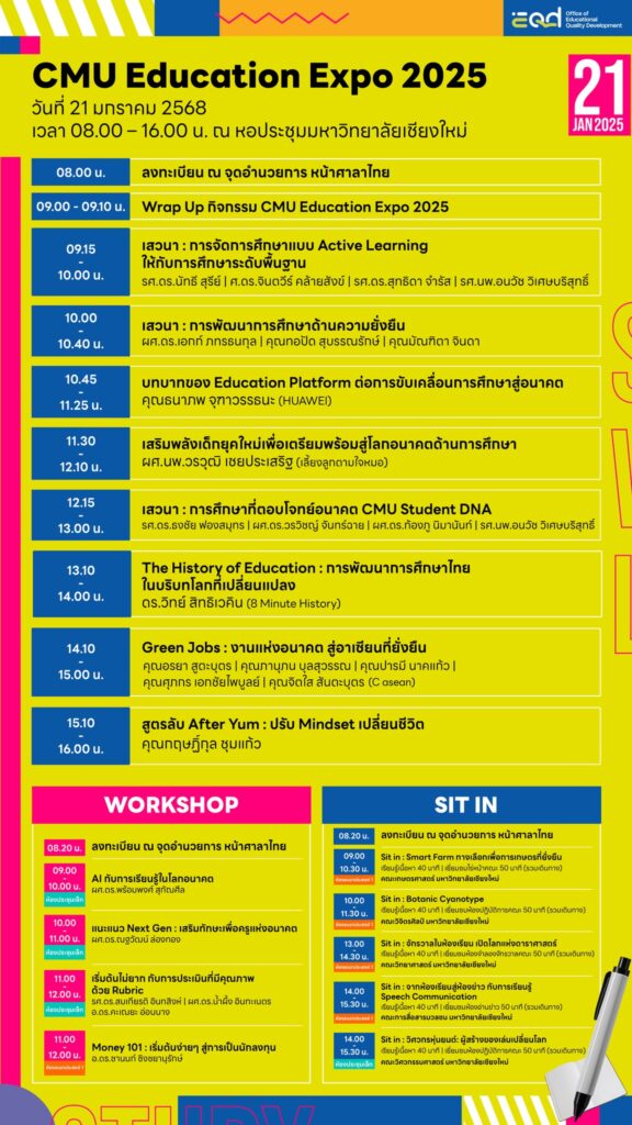 EZ Webmaster December 19, 2024 EZ Webmaster December 19, 2024 CMU EDUCATION EXPO 2025 มหาวิทยาลัยเชียงใหม่ พลาดไม่ได้แล้ว เตรียมตัวให้พร้อม มหาวิทยาลัยเชียงใหม่(มช) ยินดีต้อนรับทุก ๆ ท่านเข้าสู่กิจกรรมฉลองสุดยิ่งใหญ่ในรอบ 60 ปี CMU EDUCATION EXPO 2025: EDUCATION FOR SUSTAINABLE DEVELOPMENT เพื่อเน้นไปที่การศึกษาและการพัฒนาอย่างยั่งยืน ประเด็นหลัก ๆ เลยคือ อยากกระตุ้นให้ทุกคนเรียนรู้และเข้าใจเกี่ยวกับการพัฒนาที่สำคัญในด้านต่าง ๆ ผ่านการจัดกิจกรรมที่หลากหลาย ไฮไลท์กิจกรรมที่ไม่ควรพลาด Conference โดยวิทยากรระดับประเทศ Workshop ที่จะพาคุณเรียนรู้จากอาจารย์แนวหน้า ใหม่! CMU SIT IN – กิจกรรมทดลองเรียนรู้เสมือนนั่งอยู่ในห้องเรียนจริงๆ บูธนิทรรศการ จากคณะ/วิทยาลัย/ส่วนงานในมหาวิทยาลัยเชียงใหม่ และเครือข่ายองค์กรชั้นนำ ขอบคุณภาพจากเพจ CMU OPEN HOUSE เปิดลงทะเบียนพร้อมกันทั่วประเทศ ฟรี! ไม่มีค่าใช้จ่าย เวลา 10.00 น. วันที่ 19 ธันวาคม 2567 เป็นต้นไป แล้วมาเจอกัน 20 – 21 มกราคม 2568 ที่หอประชุมมหาวิทยาลัยเชียงใหม่ แล้วมาเจอกันที่งาน CMU EDUCATION EXPO 2025!