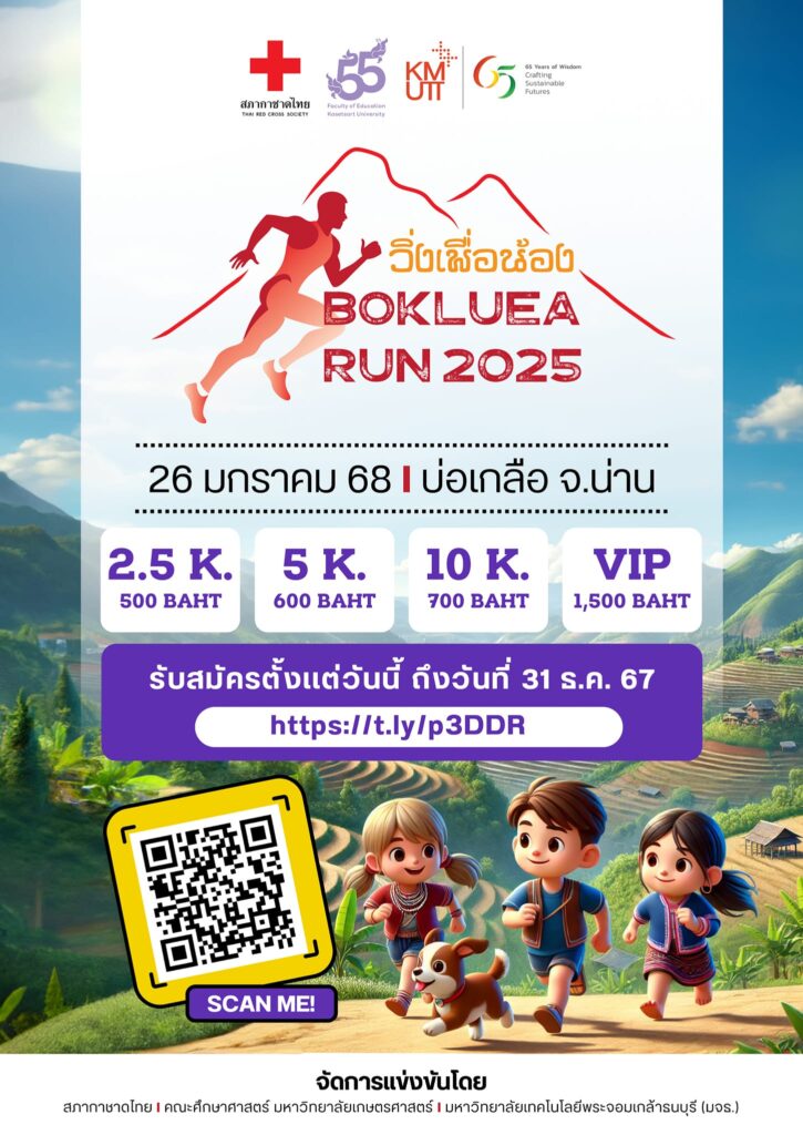 มหาวิทยาลัยเทคโนโลยีพระจอมเกล้าธนบุรี ศูนย์ประสานงาน (มจธ.) พื้นที่จังหวัดน่าน ร่วมกับสภากาชาดไทย และคณะศึกษาศาสตร์ มหาวิทยาลัยเกษตรศาสตร์ จัดกิจกรรมชวน ” วิ่งเพื่อน้อง BOKLUEA RUN “ ณ โรงเรียนบ้านบ่อหลวง อำเภอบ่อเกลือ จังหวัดน่าน ในวันอาทิตย์ที่ 26 มกราคม 2568 ภายในงาน นอกจากจะได้วิ่งออกกำลังกายเพื่อส่งเสริมสุขภาพที่ดีแล้ว ยังได้สัมผัสบรรยากาศที่เเสนสดชื่นตลอดเส้นทางวิ่ง และได้ร่วมทริปการท่องเที่ยวเชิงวัฒนธรรมที่จะพาคุณไปสัมผัสประสบการณ์ใหม่กับชาวบ่อเกลือ นอกจากนี้ยังได้ร่วมทำบุญ โดยรายได้หลังหักค่าใช้จ่ายจะมอบให้กับโครงการส่งเสริมและพัฒนาทักษะการพูด อ่าน เขียนภาษาไทย ให้เเก่เด็กและเยาวชนพื้นที่สูงในจังหวัดน่านอีกด้วย ด่วน! สมัครได้แล้ววันนี้ จนถึงวันที่ 31 ธันวาคม 2567 ผู้สนใจสามารถติดตามรายละเอียดเพิ่มเติมได้ทาง https://www.runlah.com/events/bkr2025 หรือที่ https://www.facebook.com/share/p/1Bkn3iYTJV/