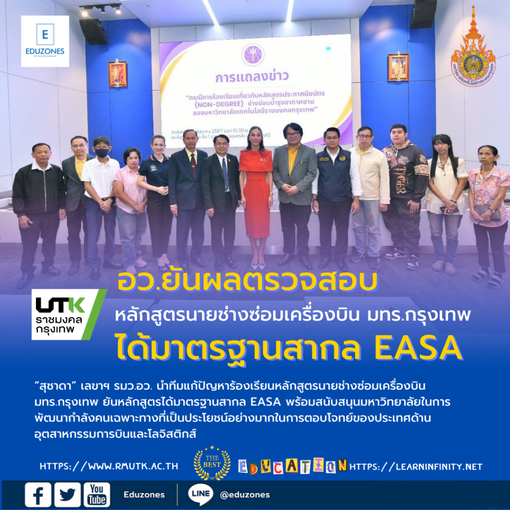 tui sakrapee December 23, 2024 tui sakrapee December 23, 2024 หลักสูตรนายช่างซ่อมเครื่องบิน มทร.กรุงเทพ อว.สอบแล้ว ยันชัดได้มาตรฐานสากล EASA “สุชาดา” เลขาฯ รมว.อว. นำทีมแก้ปัญหาร้องเรียนหลักสูตรนายช่างซ่อมเครื่องบิน มทร.กรุงเทพ ยันหลักสูตรได้มาตรฐานสากล EASA เมื่อวันที่ 23 ธ.ค. น.ส.สุชาดา ซาง แทนทรัพย์ เลขานุการ รมว.การอุดมศึกษา วิทยาศาสตร์ วิจัยและนวัตกรรม (อว.) พร้อมด้วย นายวันนี นนท์ศิริ ผู้ตรวจราชการกระทรวง อว. นายบุญช่วย เจริญผล ผู้ช่วยอธิการบดีมหาวิทยาลัยเทคโนโลยีราชมงคลกรุงเทพ (มทร.กรุงเทพ) คณะผู้บริหาร มทร.กรุงเทพ และ รศ.ดร.วีรชัย พุทธวงษ์ ผู้ช่วยอธิการบดีมหาวิทยาลัยเกษตรศาสตร์ หรือ อ.อ๊อด และมูลนิธิรณรงค์ทวงคืนความยุติธรรม ร่วมแถลงข่าว “กรณีการร้องเรียนเกี่ยวกับหลักสูตรประกาศนียบัตร (Non-Degree) ช่างซ่อมบำรุงอากาศยาน ของ มทร.กรุงเทพ ที่ ห้องแถลงข่าว อาคารพระจอมเกล้า สำนักงานปลัดกระทรวง อว. (โยธี) น.ส.สุชาดา กล่าวว่า ตามที่ได้มีประเด็นการร้องเรียนเกี่ยวกับมาตรฐานการจัดการเรียนการสอนหลักสูตรประกาศนียบัตร (Non-Degree) ช่างซ่อมบำรุงอากาศยานของ มทร.กรุงเทพ น.ส.ศุภมาส อิศรภักดี รมว.อว. ก็ได้สั่งการให้เร่งดำเนินการแก้ไขปัญหาโดยด่วน โดยได้มีการประสานผู้บริหารมหาวิทยาลัยและผู้เกี่ยวข้องเพื่อตรวจสอบและหารือแนวทางการแก้ไขปัญหา ซึ่งจากการตรวจสอบพบว่า หลักสูตรช่างซ่อมบำรุงอากาศยานดังกล่าวเป็นหลักสูตรประกาศนียบัตร (Non-Degree) อยู่ในอำนาจของสภามหาวิทยาลัย และได้ดำเนินการจัดการเรียนการสอนเป็นไปตามมาตรฐานสากลของสำนักความปลอดภัยการบินของสหภาพยุโรป ที่เรียกว่า EASA : European Union Aviation Safety Agency สำหรับผู้ร้องเรียนนั้น กระทรวง อว. ได้ประสานเพื่อหารือแนวทางให้ความช่วยเหลือ ซึ่ง มทร.กรุงเทพ และผู้ร้องเรียนได้ประชุมร่วมกันเมื่อวันที่ 18 ธันวาคม 2567 โดยได้ข้อสรุปและได้ทำความตกลงเข้าใจร่วมกันเป็นที่เรียบร้อยแล้ว ซึ่งทางมหาวิทยาลัยได้ให้ความช่วยเหลือ โดยสนับสนุนเป็นทุนการศึกษาและให้เข้าศึกษาต่อในระดับอุดมศึกษาในสาขาวิชาที่ต้องการประสงค์ เพื่อเป็นการเปิดโอกาสทางการศึกษาและเป็นการพัฒนาอนาคตกำลังคนของประเทศให้มีความเจริญก้าวหน้า “ขอยืนยันว่า กระทรวง อว.ได้เข้ามาตรวจสอบเรื่องนี้อย่างละเอียดรอบคอบและโปร่งใส ขอให้สื่อมวลชนช่วยกันเป็นกระบอกเสียงในการสื่อสารไปยังสาธารณชนให้ได้รับทราบข้อมูลที่ถูกต้อง และเพื่อเป็นแนวทางต่อประชาชนผู้สนใจในการศึกษาต่อและสนับสนุนทางมหาวิทยาลัยในการพัฒนากำลังคนเฉพาะทางที่เป็นประโยชน์อย่างมากในการตอบโจทย์ของประเทศด้านอุตสาหกรรมการบินและโ