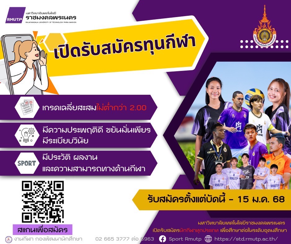 EZ Webmaster December 24, 2024 EZ Webmaster December 24, 2024 ราชมงคลพระนคร ให้ทุนผู้มีความสามารถพิเศษด้านกีฬาดีเด่น 30 ทุน เรียนต่อ ป.ตรี ปี 2568 ราชมงคลพระนคร เปิดโอกาสสำหรับผู้ที่มีความสามารถทางด้านกีฬา เข้าศึกษาต่อ ป.ตรี 30 ทุนกีฬา พร้อมเปิดโควตานักกีฬา ไม่จำกัดที่นั่ง ประจำปี 2568 มหาวิทยาลัยเทคโนโลยีราชมงคลพระนคร เปิดรับสมัครและการคัดเลือกนักศึกษา ที่มีความสามารถทางกีฬาดีเด่น เข้าศึกษาต่อระดับปริญญาตรี ประจำปีการศึกษา 2568 รับโดยวิธีสอบตรง ประเภททุนการศึกษาสำหรับนักศึกษาที่มีความสามารถพิเศษด้านกีฬา จำนวน 30 ทุน ประเภทกีฬาวอลเลย์บอล วอลเลย์บอลชายหาด ฟุตบอล ฟุตซอล ฟุตวอลเลย์ บาสเกตบอล เซปักตะกร้อ เปตอง มวยสากลสมัครเล่น มวยไทยสมัครเล่น ปันจักสีลัต คาราเต้โด เทควันโด แบดมินตัน เทเบิลเทนนิส ลีลาศ กรีฑา เทนนิส ว่ายน้ำ หมากรุก หมากล้อม ตะกร้อลอดห่วง จักรยาน หรืออื่น ๆ และประเภทโควตา เข้าเรียนสำหรับนักศึกษาที่มีความสามารถพิเศษด้านกีฬาไม่จำกัดที่นั่ง เข้าศึกษาต่อใน 9 คณะ ได้แก่ คณะครุศาสตร์อุตสาหกรรม คณะเทคโนโลยีคหกรรมศาสตร์ คณะเทคโนโลยีสื่อสารมวลชน คณะบริหารธุรกิจ คณะวิทยาศาสตร์และเทคโนโลยี คณะวิศวกรรมศาสตร์ ทุนคณะศิลปศาสตร์ คณะอุตสาหกรรมสิ่งทอและออกแบบแฟชั่น และ คณะสถาปัตยกรรมศาสตร์ โดยคุณสมบัติผู้สมัคร ต้องมีเกรดเฉลี่ยสะสมไม่ต่ำกว่า 2.00 ตรงตามคณะหรือสาขาที่เลือกเข้าศึกษา มีประวัติ ผลงานและความสามารถทางด้านกีฬา หรือเป็นนักกีฬาที่มีความสามารถทางกีฬาดีเด่นในระดับหนึ่งในชนิดกีฬาที่ระบุข้างต้น โดยนับผลงานย้อนหลัง 5 ปี อาทิ นักกีฬาตัวแทนทีมชาติ/เยาวชนทีมชาติ นักกีฬาที่เข้าร่วมแข่งขันกีฬาแห่งชาติ/เยาวชนแห่งชาติ นักกีฬาโรงเรียนในการแข่งขันกีฬาระดับนานาชาติ หรือนักกีฬาที่เข้าชิงชนะเลิศแห่งประเทศไทยระดับเยาวชนและทั่วไป มีความขยันหมั่นเพียร มีความประพฤติดี มีระเบียบวินัยอยู่สม่ำเสมอ ผู้สนใจยื่นใบสมัครได้ตั้งแต่บัดนี้ – 15 มกราคม 2568 ที่ระบบรับสมัคร โดยผู้สมัครจะต้องกรอกข้อมูลการสมัคร 2 ขั้นตอน ขั้นตอนที่ 1 สมัครลงทะเบียนเข้าเป็นนักศึกษาภาคปกติ รอบ TCAS1 ที่เว็บไซต์ https://reg.rmutp.ac.th/registrar/apphome.asp และขั้นตอนที่ 2 ให้ยื่นเอกสารหลักฐานคุณสมบัติด้านกีฬา ในรอบรับตรง รอบที่ 1 ผ่านลิงก์ https://std.rmutp.ac.th/sais/sport/sport_main.php สอบถามข้อมูลเพิ่มเติมที่ งานกีฬา กองพัฒนานักศึกษา มหาวิทยาลัยเทคโนโลยีราชมงคลพระนคร โทรศัพท์ 02 665 3777 ต่อ 6963 ดูรายละเอียดเพิ่มเติมที่ https://std.rmutp.ac.th/sais/sport/pic/COTA_SPORT_TCAS-1_2568.pdf
