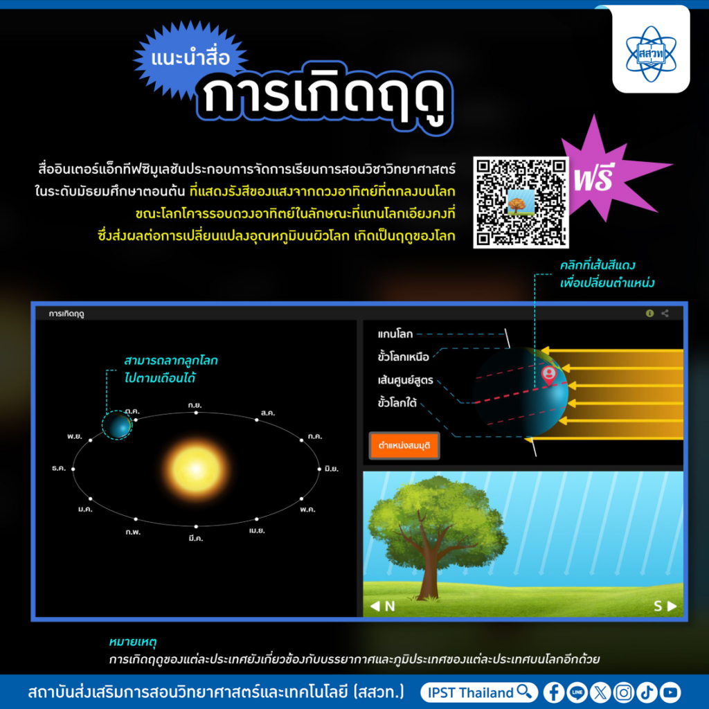 EZ Webmaster December 24, 2024 EZ Webmaster December 24, 2024 “ร้อน ฝน หนาว” ถึงคราวเปลี่ยนฤดู เติมความรู้ด้วยสื่อ สสวท. “การเกิดฤดู” สถาบันส่งเสริมการสอนวิทยาศาสตร์และเทคโนโลยี (สสวท.) พาเรียนรู้ว่าฤดูเกิดได้อย่างไร กับสื่ออินเตอร์แอ็กทีฟซิมูเลชัน “การเกิดฤดู” สื่อการเรียนการสอนวิทยาศาสตร์ โลก ดาราศาสตร์ และอวกาศ มัธยมศึกษาปีที่ 3 อธิบายให้เห็นรังสีของแสงจากดวงอาทิตย์ที่ตกลงบนโลก ขณะโลกโครจรรอบดวงอาทิตย์ในลักษณะที่แกนโลกเอียงคงที่ ซึ่งส่งผลต่อ การเปลี่ยนแปลงอุณหภูมิบนผิวโลกและทำให้เกิด “ฤดูของโลก” นั่นเอง ดาวน์โหลดเติมพลังสอนให้ชั้นเรียนที่ คลังความรู้ SciMath สสวท. https://www.scimath.org/desktop-application/item/10591 หรือคลังสื่อการสอน สสวท https://myipst.ipst.ac.th/medias/การเกิดฤดู