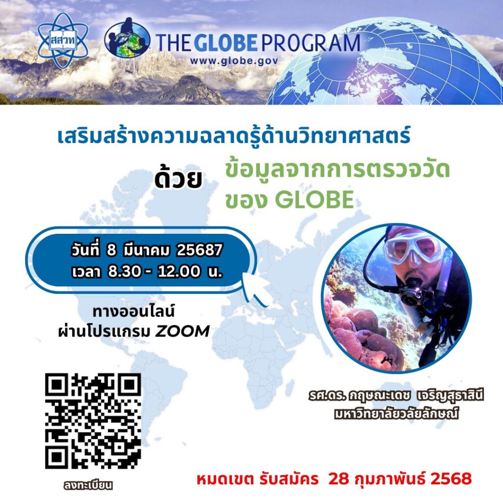 EZ Webmaster January 28, 2025 EZ Webmaster January 28, 2025 สสวท. อบรมออนไลน์เสริมศักยภาพครู “ฉลาดรู้วิทย์ด้วยข้อมูลจากการตรวจวัด GLOBE” สถาบันส่งเสริมการสอนวิทยาศาสตร์และเทคโนโลยี (สสวท.) โดยโครงการ GLOBE ฝ่ายพัฒนาครูและบุคลากรทางการศึกษา ขอเชิญครูผู้สนใจอบรมหลักสูตรส่งเสริมศักยภาพการทำงานวิทยาศาสตร์วิจัยสิ่งแวดล้อม ในรูปแบบออนไลน์ หัวข้อ “เสริมสร้างความฉลาดรู้ด้านวิทยาศาสตร์ด้วยข้อมูลจากการตรวจวัดของ GLOBE” โดยวิทยากร รศ.ดร. กฤษณะเดช เจริญสุธาสินี มหาวิทยาลัยวลัยลักษณ์ วันเสาร์ที่ 8 มีนาคม 2568 เวลา 8.30-12.00 น. อบรมผ่านโปรแกรม ZOOM สนใจสมัครที่ลิงก์ https://endb.ipst.ac.th/activity/detail/304 สมัครได้ถึงวันที่ 28 กุมภาพันธ์ 2568 สอบถามที่อีเมล globeworkshop@proj.ipst.ac.th โทรศัพท์ 02 392 4021 ต่อ 1751 ดูรายละเอียดที่เฟซบุ๊ก GLOBE Thailand https://www.facebook.com/GLOBEThailandOfficial