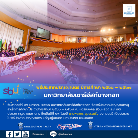 tui sakrapee January 27, 2025 มหาวิทยาลัยเซาธ์อีสท์บางกอก จัดพิธีประสาทปริญญาบัตร ประจำปีการศึกษา ๒๕๖๖ – ๒๕๖๗ tui sakrapee January 27, 2025 วันอาทิตย์ที่ ๒๖ มกราคม ๒๕๖๘ มหาวิทยาลัยเซาธ์อีสท์บางกอก จัดพิธีประสาทปริญญาบัตรผู้สำเร็จการศึกษา ประจำปีการศึกษา ๒๕๖๖ – ๒๕๖๗ ณ หอรัชมงคล สวนหลวง ร.๙ เขตประเวศ กรุงเทพมหานคร ซึ่งเป็นปีที่ ๒๓ โดยมี นายพลากร สุวรรณรัฐ องคมนตรี เป็นประธานในพิธีประสาทปริญญาบัตร แก่ดุษฎีบัณฑิต มหาบัณฑิต และบัณฑิต ในปีนี้มหาวิทยาลัยได้มอบปริญญาดุษฎีบัณฑิตกิตติมศักดิ์ แก่ผู้ทรงคุณวุฒิ ๓ ท่าน ดังนี้ ๑) … Continue Reading