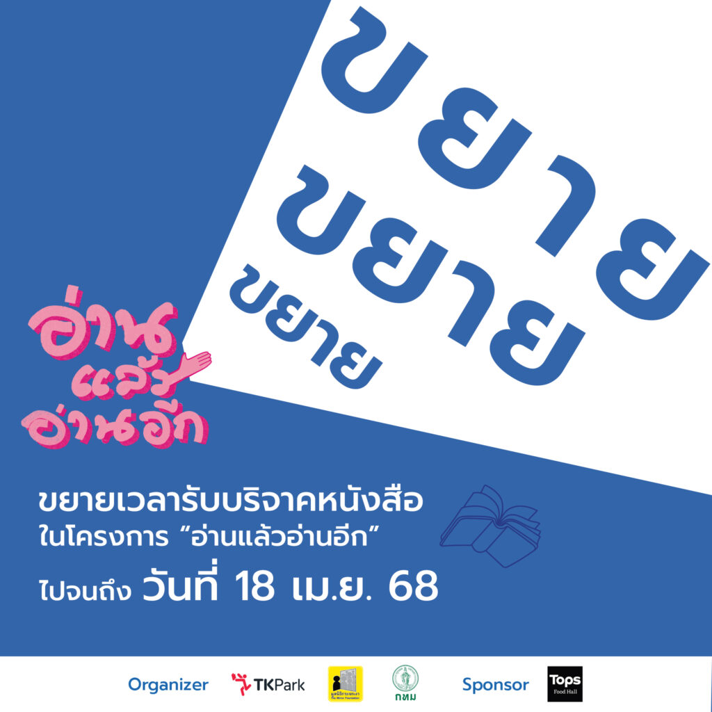 EZ Webmaster February 25, 2025 EZ Webmaster February 25, 2025 ทีเคพาร์ค ขยายเวลาบริจาคหนังสือ 1 ล้านเล่ม ในโครงการ “อ่านแล้ว อ่านอีก” ถึง 18 เมษายน 2568 สถาบันอุทยานการเรียนรู้ (TK Park) ประกาศขยายเวลาการรับบริจาคหนังสือในแคมเปญ “อ่านแล้ว อ่านอีก” หนึ่งในกิจกรรมสำคัญ ในโอกาสฉลองครบรอบ 20 ปี ทีเคพาร์ค ที่ร่วมกับมูลนิธิกระจกเงา เชิญชวนคนไทยส่งต่อหนังสือเพื่อสร้างสังคมแห่งการเรียนรู้ ตั้งเป้ารวบรวม 1 ล้านเล่ม เพื่อนำไปมอบให้แก่ห้องสมุดและแหล่งเรียนรู้ 2,000 แห่งทั่วประเทศ ผู้ที่สนใจยังสามารถร่วมบริจาคหนังสือได้ที่ อุทยานการเรียนรู้ TK Park ชั้น 8 ศูนย์การค้าเซ็นทรัลเวิลด์ และมูลนิธิกระจกเงา ตั้งแต่วันนี้ จนถึง 18 เมษายน 2568 ติดตามรายละเอียดและสอบถามข้อมูลเพิ่มเติมได้ที่ readforward.tkpark.or.th