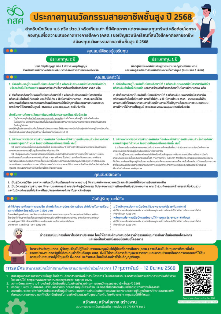 EZ Webmaster February 27, 2025 EZ Webmaster February 27, 2025 ทุนนวัตกรรมสายอาชีพชั้นสูง กสศ. ปี 2568 เปิดรับสมัครแล้ว “ทุนนวัตกรรมสายอาชีพชั้นสูง กสศ. ปี 2568” โอกาสเรียนต่อหลักสูตร ปวส./อนุปริญญา 2 ปี, หลักสูตรผู้ช่วยพยาบาล ผู้ช่วยทันตแพทย์ 1 ปี และหลักสูตรประกาศนียบัตรพนักงานให้การดูแล ระยะเวลา 6 เดือน . ภารกิจหลักด้านหนึ่งของกองทุนเพื่อความเสมอภาคทางการศึกษาหรือ กสศ. คือการช่วยเหลือเยาวชนผู้ขาดแคลนทุนทรัพย์ให้มีโอกาสศึกษาต่อเต็มศักยภาพ ด้วยงบประมาณจำกัด เราคิดค้นวิธีการลงทุนเพื่อพัฒนาเรื่องนี้ให้ถูกจุด เริ่มต้นจากโจทย์ที่ว่าการเรียนรูปแบบไหน ที่สร้างโอกาสให้กับเยาวชนกลุ่มนี้มากที่สุด และยังตอบโจทย์ทางเศรษฐกิจของประเทศควบคู่กันไปด้วย . ทุนนวัตกรรมสายอาชีพชั้นสูง ของ กสศ. เป็นทุนให้เปล่าที่สร้างโอกาสทางการศึกษาแก่เยาวชน จากครัวเรือนที่มีรายได้ต่ำสุดร้อยละ 20 ล่างของประเทศ มีโอกาสศึกษาต่อสายอาชีพในสาขาซึ่งเป็นที่ต้องการของตลาดแรงงาน . ทุนนวัตกรรมสายอาชีพชั้นสูง กสศ. ปีการศึกษา 2568 รับสมัครนักเรียนระหว่างวันที่ 17 กุมภาพันธ์ – 12 มีนาคม 2568 โอกาสสำหรับ นักเรียนที่กำลังศึกษาอยู่ในระดับชั้นมัธยมศึกษาปีที่ 6 หรือระดับประกาศนียบัตรวิชาชีพ (ปวช.) ชั้นปีที่ 3 หรือระดับอื่นใดเทียบเท่า และคาดว่าจะสำเร็จการศึกษาในปีการศึกษา 2567 นักเรียนที่สำเร็จการศึกษาในระดับชั้นมัธยมศึกษาปีที่ 6 หรือระดับประกาศนียบัตรวิชาชีพ ชั้นปีที่ 3 หรือระดับอื่นใดที่เทียบเท่า มาแล้วไม่เกิน 2 ปี (ปีการศึกษา 2565 – 2566) และได้รับการเสนอชื่อโดยคณะกรรมการขับเคลื่อนการแก้ไขปัญหาเด็กและเยาวชนนอกระบบการศึกษาให้กลายเป็นศูนย์ (Thailand Zero Dropout) ระดับจังหวัด ประเภททุน เอกสารการสมัคร 2 ปี (ปวส./อนุปริญญา) สำหรับนักเรียนที่กำลังศึกษาชั้นมัธยมศึกษาปีที่ 6 ปวช.3 หรือเทียบเท่า ดาวน์โหลดใบสมัคร word คลิก ดาวน์โหลดใบสมัคร pdf คลิก 2 ปี ปวส./อนุปริญญา สำหรับสถานศึกษาผลิตและพัฒนากำลังคนสายอาชีพระดับจังหวัด สำหรับนักเรียนที่กำลังศึกษาชั้นมัธยมศึกษาปีที่ 6 ปวช.3 หรือเทียบเท่า ดาวน์โหลดใบสมัคร word คลิก ดาวน์โหลดใบสมัคร pdf คลิก 1 ปี หลักสูตรประกาศนียบัตรผู้ช่วยพยาบาล/ผู้ช่วยทันตแพทย์ และหลักสูตรประกาศนียบัตรพนักงานให้การดูแล (ระยะเวลา 6 เดือน) สำหรับนักเรียนที่กำลังศึกษาชั้นมัธยมศึกษาปีที่ 6 ปวช.3 หรือเทียบเท่า ดาวน์โหลดใบสมัคร word คลิก ดาวน์โหลดใบสมัคร pdf คลิก หลักสูตรประกาศนียบัตรพนักงานให้การดูแล (ระยะเวลา 6 เดือน) สำหรับนักเรียนที่กำลังศึกษาชั้นมัธยมศึกษาปีที่ 6 ปวช.3 หรือเทียบเท่า ดาวน์โหลดใบสมัคร word คลิก ดาวน์โหลดใบสมั